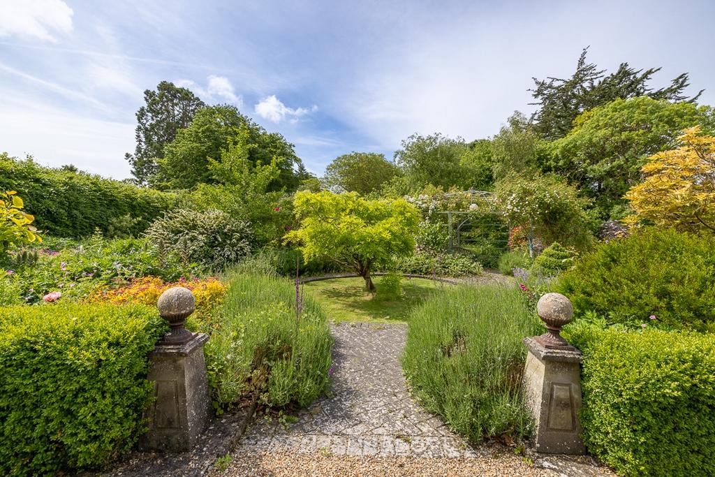 On one side is a lawned area maintained by the owners of the Manor. On the other side of the drive are south facing, well stocked herbaceous borders divided by box hedges filled with peonies, roses and bluebells.