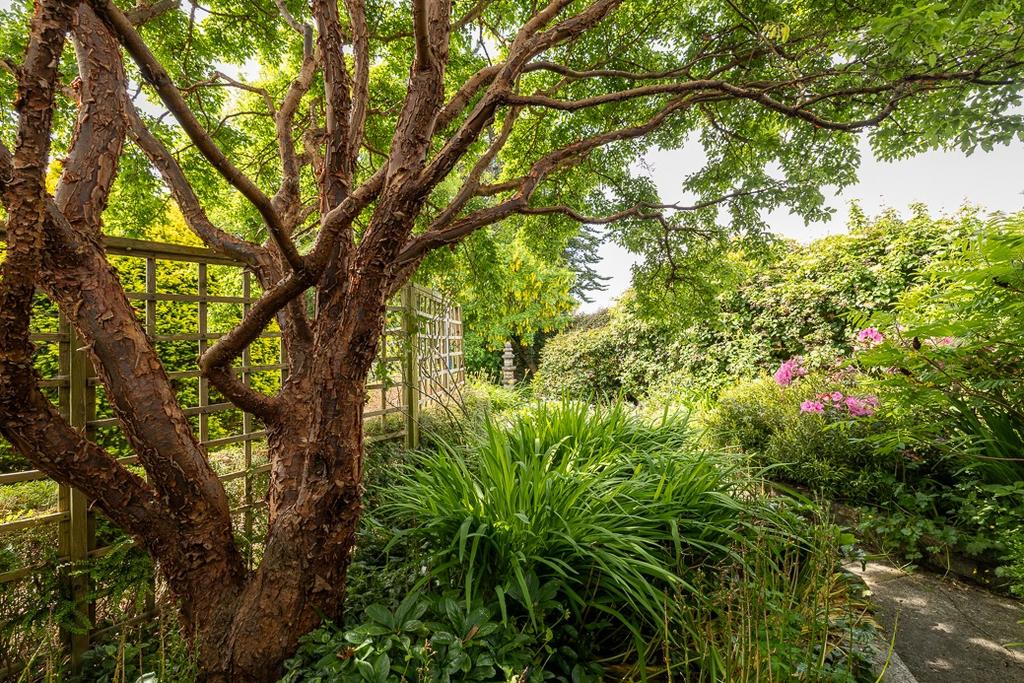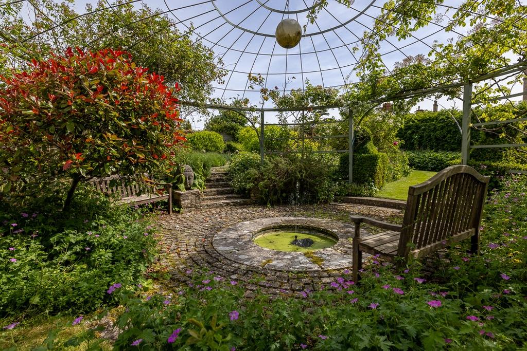 Beyond, the stage, the garden path leads through a yew arch to a wildflower area and a peaceful and tranquil 'meditation' pavilion of timber and brick construction with open sides on the south and east with views to the church overlooking the koi carp pond.