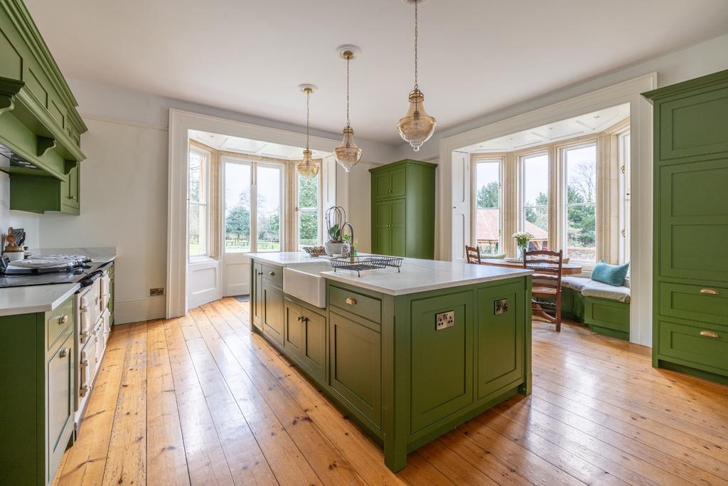 The bespoke kitchen is extremely well fitted with hand painted units, a larder cupboard, huge island and integrated appliances including a 4-oven electric Aga centerpiece and luxurious wine fridge.