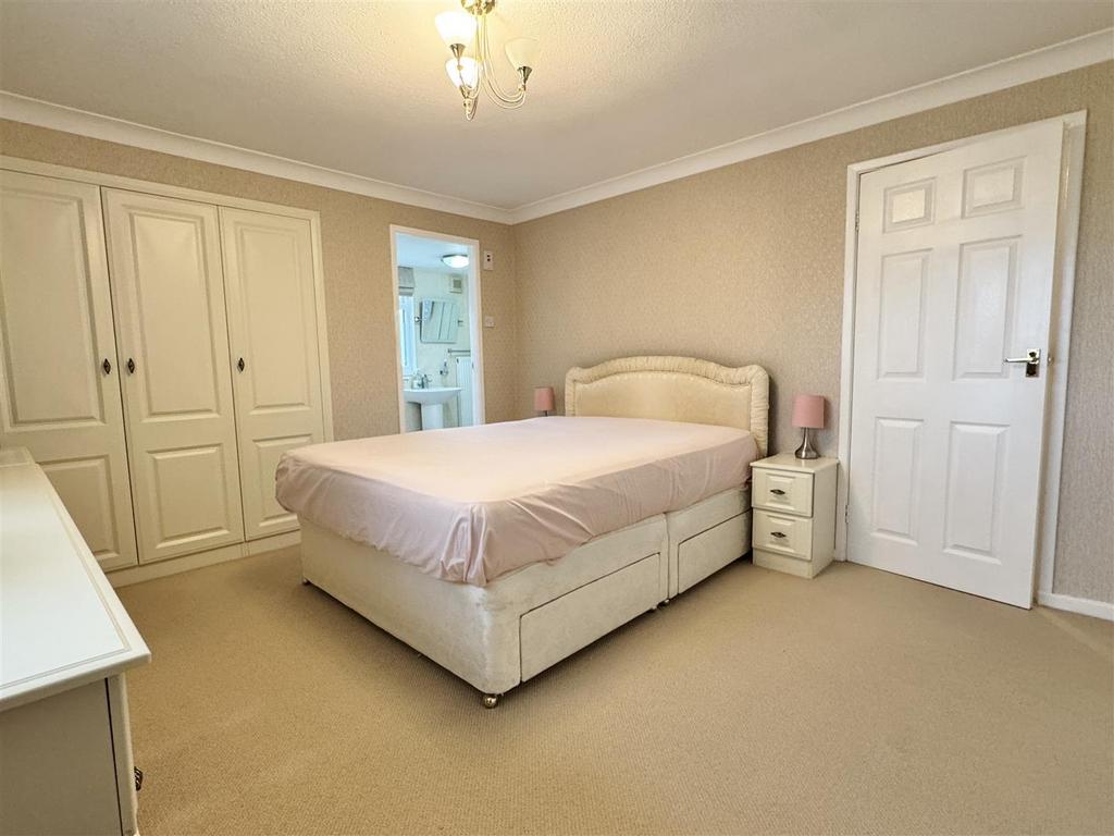 Bedroom Suite One - 3.96m x 3.68m (13' x 12'1) - Principal en suite double bedroom. Double glazed window to the side elevation with two side opening lights. Fitted window blinds. Single panel radiator. Corniced ceiling. Television aerial point. Range of fitted bedroom furniture comprises: Bank of four fitted very deep double wardrobes, with further storage space beyond into the roof eaves. Additional double and single wardrobes and bedside drawer units. Door leads to the En Suite.
