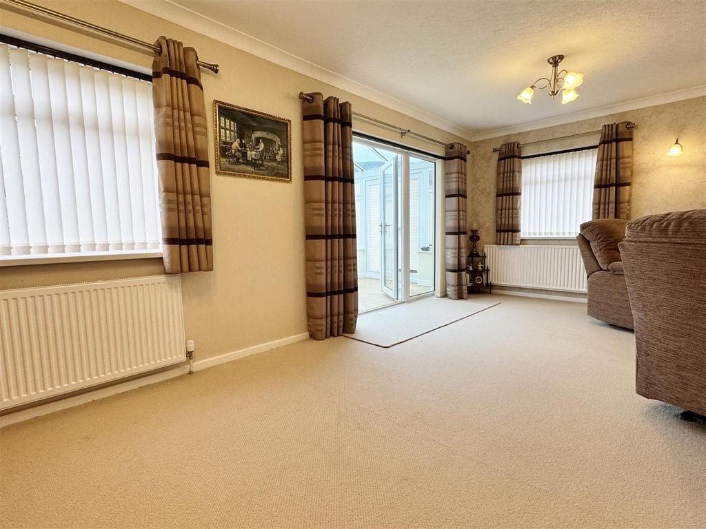 Lounge With Dining Area - 7.44m x 6.15m max (24'5 x 20'2 max) - (max L shaped measurements) Very spacious L shaped reception room. Two double glazed windows overlook the side gardens with top opening lights and fitted vertical window blinds. Television aerial point. Telephone/internet points. Corniced ceiling. Two double panel radiators. Two wall lights. Focal point of the room is a fireplace with marble effect display surround. Matching raised hearth and inset supporting a gas coal effect living flame fire. Double opening UPVC double glazed French doors lead to the adjoining Conservatory with matching full length double glazed panels to either side. Fitted vertical blinds.