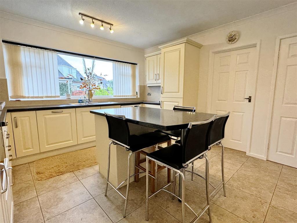 Breakfast Kitchen - 4.11m x 4.01m (13'6 x 13'2) - Good sized family Kitchen, approached from both the Hall and Lounge/Dining Room. Double glazed window overlooks the rear garden with two top opening lights and vertical blinds. Good range of eye and low level cupboards and drawers. One and a half bowl stainless steel single drainer sink unit with a centre mixer tap. Set in roll edged work surfaces with splash back tiling and concealed downlighting. Matching central Island/Breakfast Bar with further cupboards and drawers below. Built in appliances comprise: Neff four ring gas hob with a stainless steel illuminated extractor canopy above. Neff electric oven and grill. Microwave oven above. Integrated Neff dishwasher and fridge/freezer with matching cupboard fronts. Space for a tumble dryer. Concealed Baxi gas central heating boiler. Ceramic tiled floor. Single panel radiator. Corniced ceiling. Television aerial point. Two overhead lights. UPVC door with an inset obscure double glazed panel leads to the Utility.