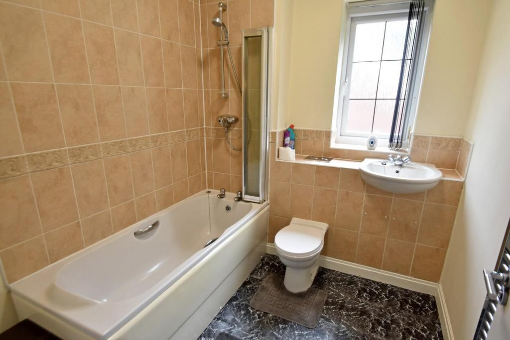 Bathroom - 2.41m x 2.09m (7'10" x 6'10") - Double glazed frosted window to the side, three piece white suite comprising of; Low level w.c, pedestal hand wash basin and panel bath with shower over, chrome heated towel rail, down lighting and extractor fan.