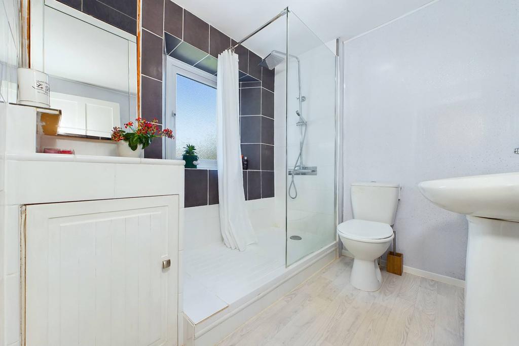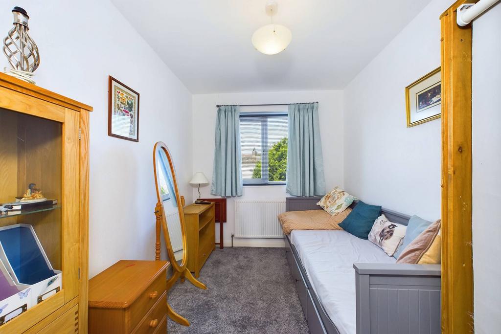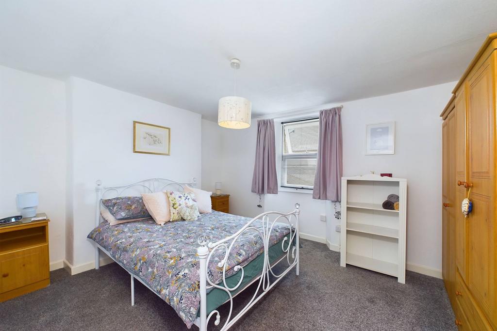On the first floor, the space is well-proportioned for a cottage of this size. It features a modern shower room with a walk-in shower, pedestal wash basin, low-level flush WC, and a wall-mounted heated towel rail. There are two bedrooms: the master, which is a spacious double, and a second, smaller double bedroom.