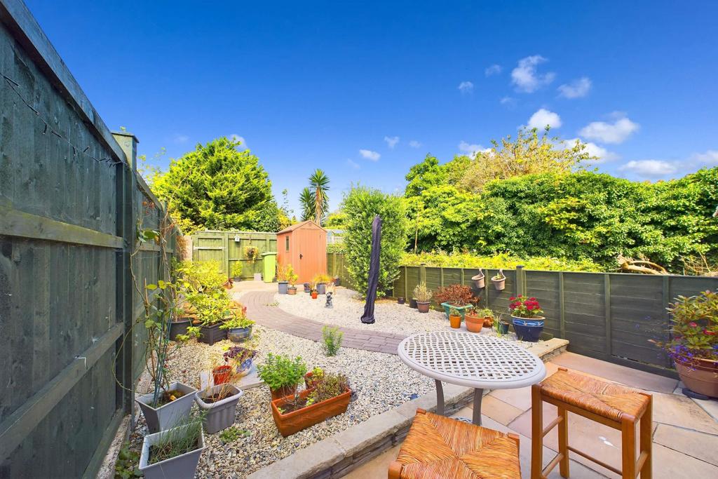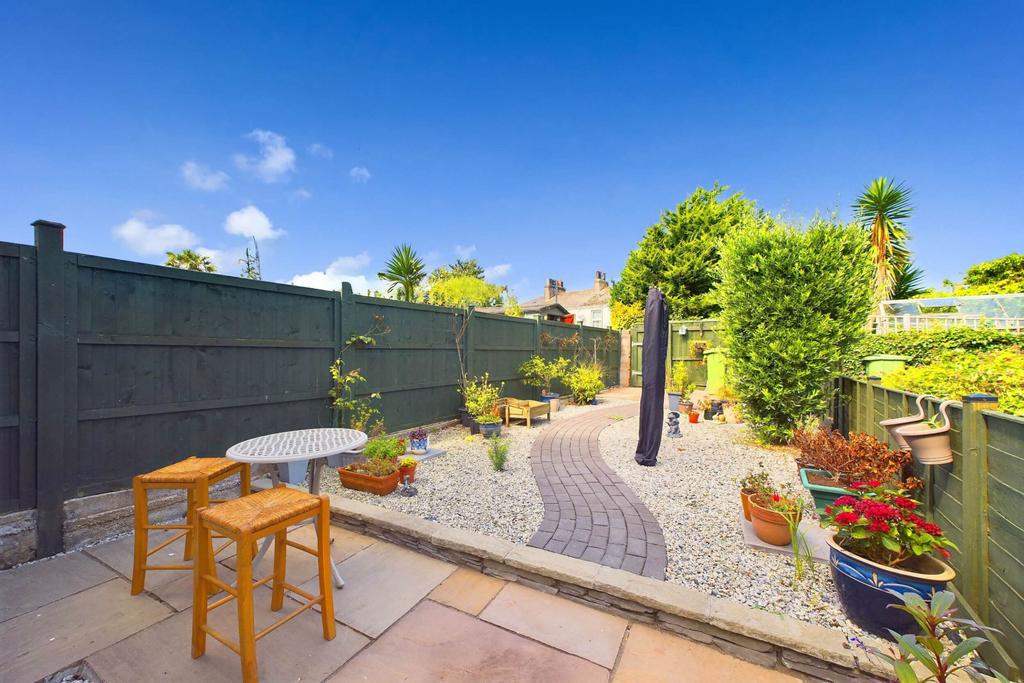 The property features a recently landscaped, enclosed rear garden, designed for low-maintenance outdoor space. Adjacent to the kitchen is a slabbed patio area, ideal for outdoor dining or relaxation. A block-paved pathway runs through a loose stone chipping area, leading to the far end of the garden, where a second slabbed patio area is located, along with a composite shed. A secure gate at the rear of the garden offers pedestrian access to a lane.