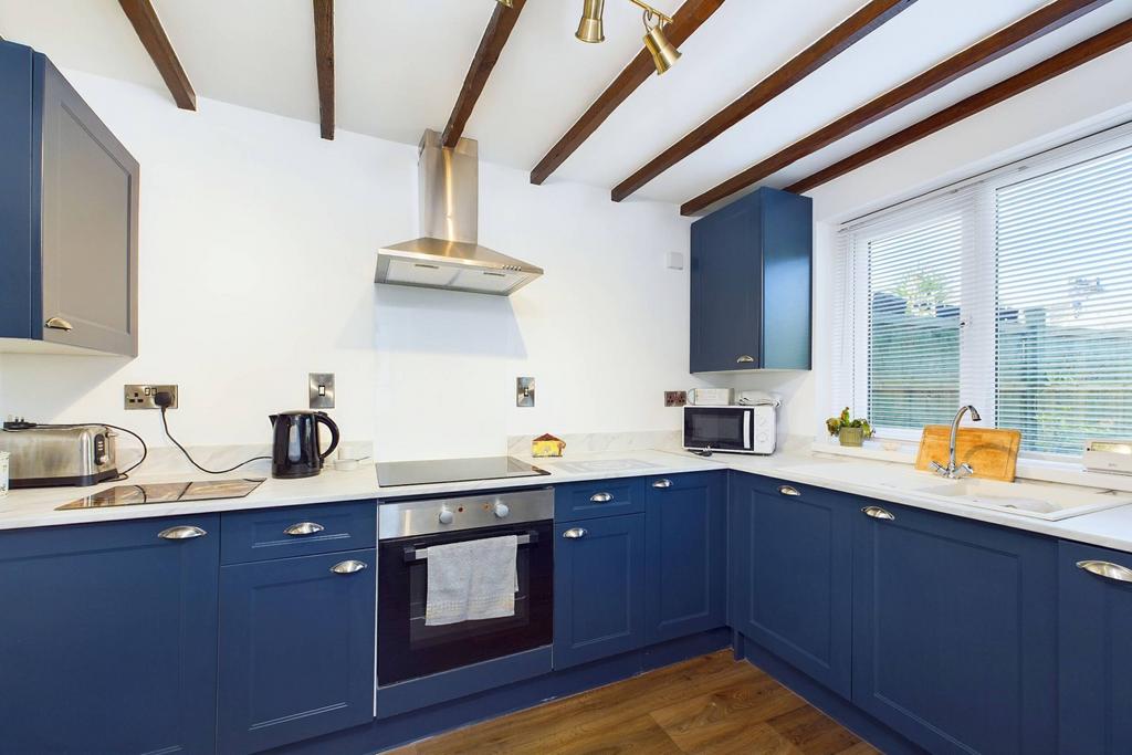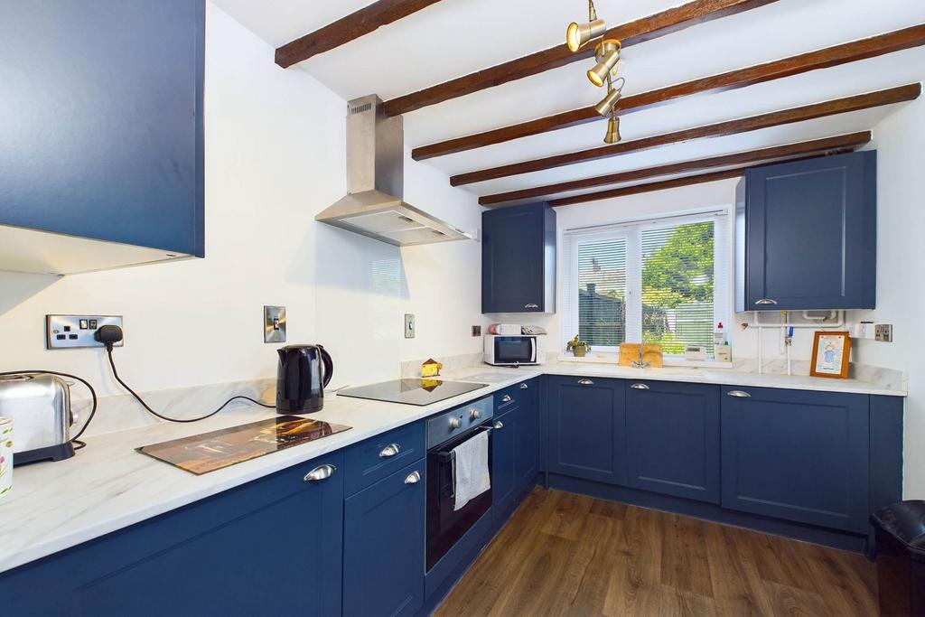 The kitchen is newly fitted and well-designed, featuring Rhino Blue wall and base cupboards. It includes attractive work surfaces with an inset sink, drainer, and countertop hob with an extractor overhead. Built-in appliances include an under-counter fridge/freezer, dishwasher, and washing machine. There is also space for a freestanding fridge/freezer. The gas boiler is concealed within matching cabinetry. A double-glazed door from the kitchen provides access to the rear garden.