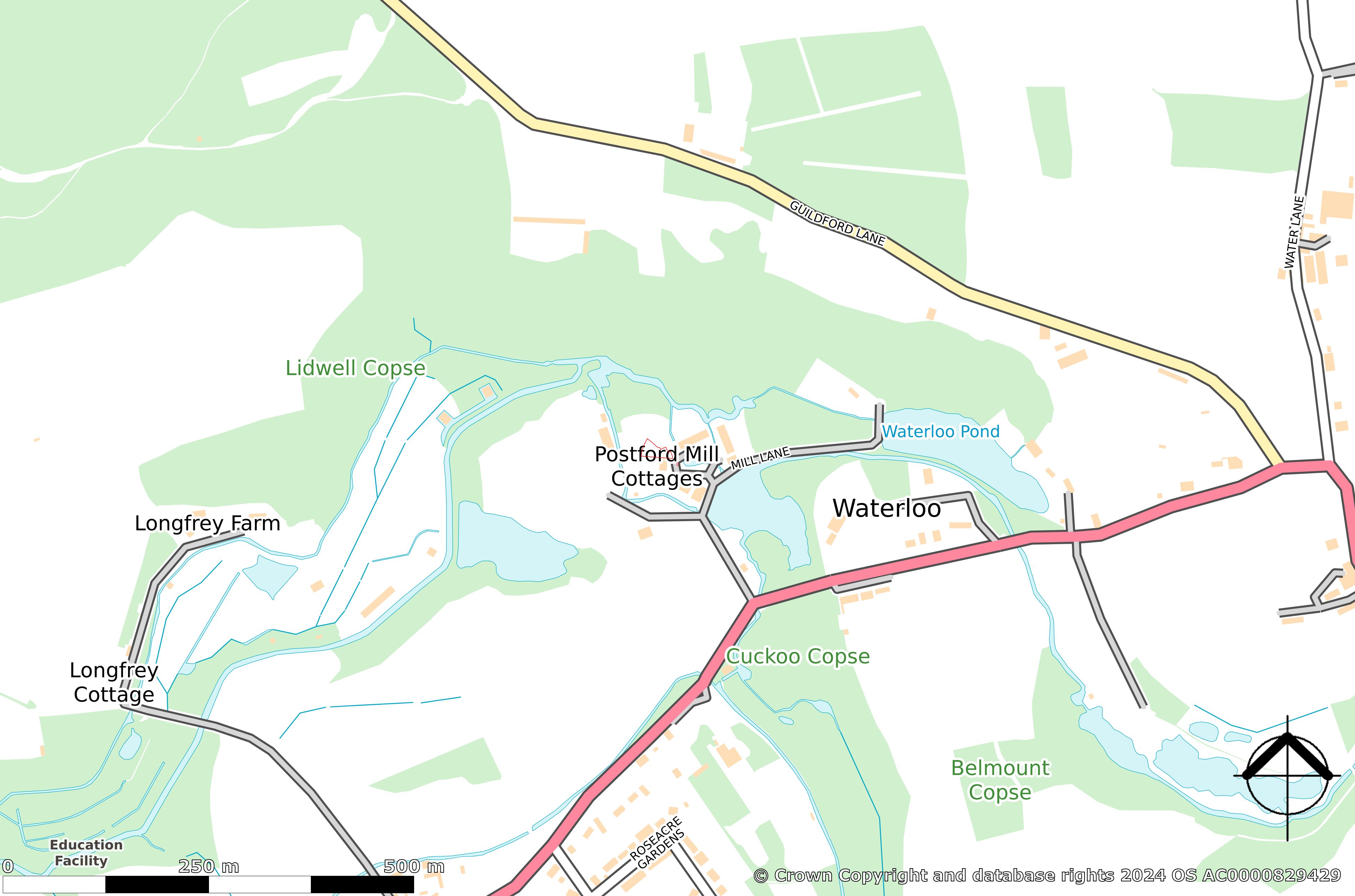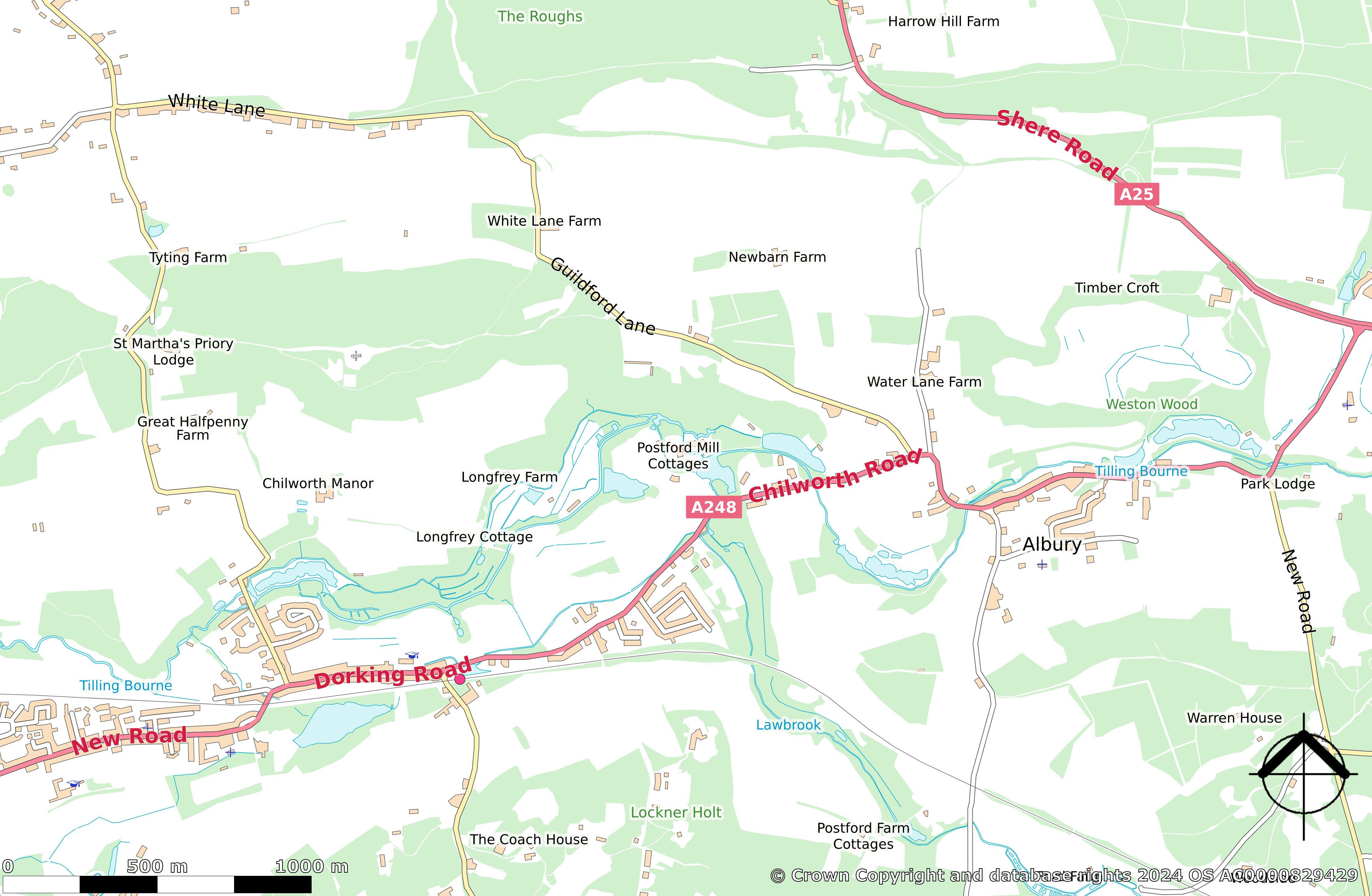 A rare opportunity to purchase a spacious & well presented 3 bedroom semi-detached family home with large private garden set within a particularly peaceful, rural setting, with a stream, waterfall, lake, woodland, and stunning rural views, on the edge of Albury village in an Area of Outstanding Natural Beauty. Ground floor accommodation comprises a large sitting room & dining area with feature fireplace with inset log burner & an extensive range of fitted floor to (almost) ceiling display and storage units to either side. Double doors lead out to a large conservatory with further double doors leading out to the patio and garden. There is also a study to the front of the property, a wc, & a well fitted kitchen/breakfast room with a good range of units with granite worktops, integrated appliances and ample space for a table and chairs. A door leads to a separate utility room with sink & a further door to the large integral garage (with pedestrian access to the rear garden). Upstairs the principal bedroom is a large double with fitted wardrobes and fantastic views over the rear garden & beyond, with an ensuite shower room shower cubicle, his & her basins, a wc & a skylight. Bedroom 2 is also a large double bedroom with fitted wardrobes, bedroom 3 is a smaller double bedroom, and there is also a family bathroom with bath, wall mounted shower & shower screen with a basin & wc set into a vanity unit. The 2nd and 3rd bedrooms overlook the pond to the front of the property. The ground and first floors are concrete construction with superb sound insulation. To the front of the property there is a dedicated parking space and visitor parking spaces, with access to the garage immediately to the right of the house. There is a picket fence and gate leading to the front garden. This is laid to lawn with mature shrubs, trees and flower borders, with a paved path leading to the front door. There is an extensive and very private paved area to the rear of the property (to both sides & the rear of the conservatory) with steps up to a large area laid to lawn (the largest garden in the development) with a post & rail fence to one side. The property is surrounded by further lawned areas & woodland, with superb views to all sides. The lane provides direct access to country walks in the Surrey Hills and up to St Martha's Church and Newlands Corner. This exceptional rural location is very peaceful yet is within a circa 10-15-minute walk of Albury village and The Drummond, or Chilworth Station and the Percy Arms. A rare opportunity !