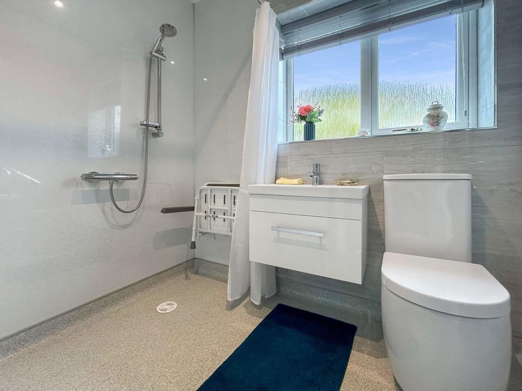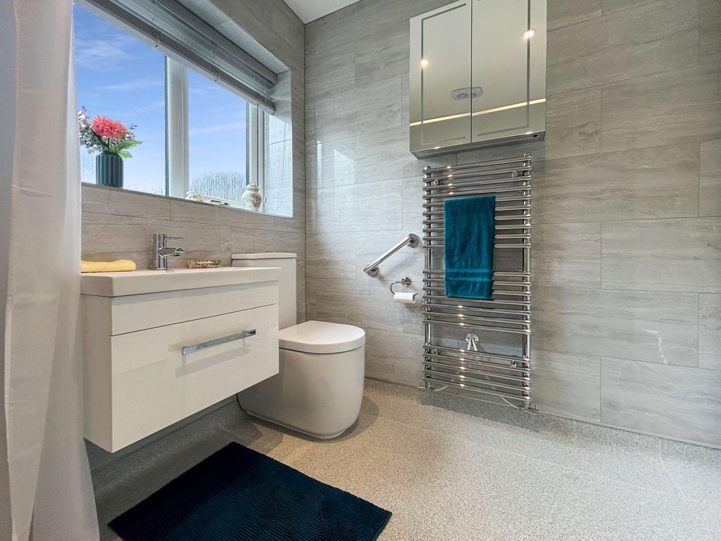 The wet room has a modern, elegant finish and comprises of a detachable shower, wash hand basin with vanity unit, low level WC, heated towel rail, and a wall hung mirrored storage cabinet.