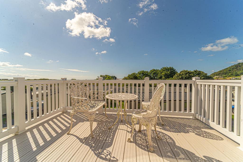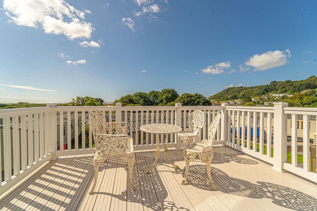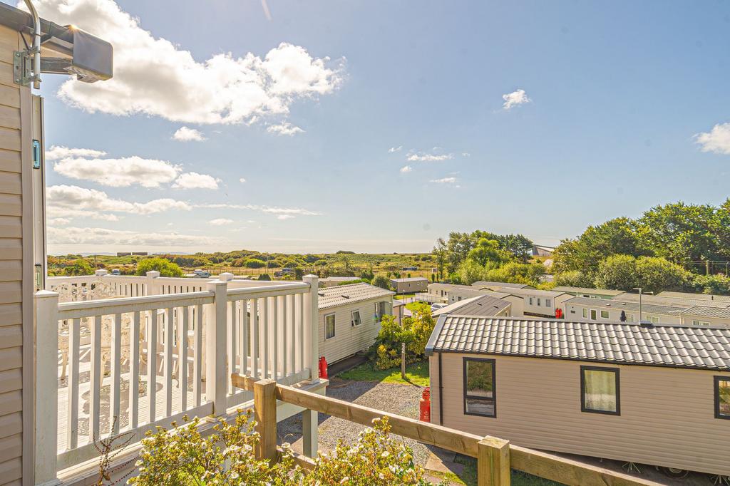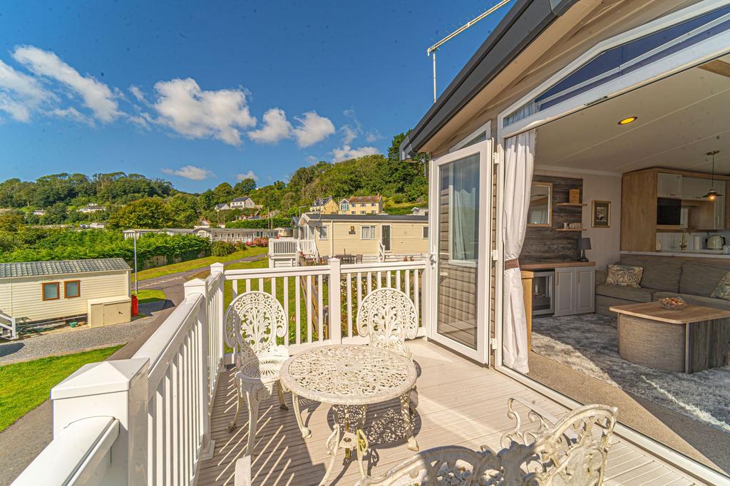 Beautifully presented throughout, we enter this stunning caravan through the side, where we are welcomed into the large living room, with the kitchen and dining room found adjacent. The living room is fitted with a charming fireplace, while the kitchen offers a multitude of storage options, as well as integrated appliances to include a range cooker with four ring gas hob, oven and grill, as well as a slimline dishwasher, microwave, washing machine, and fridge freezer. There is also a sofa bed that can accommodate an additional double bed, allowing the caravan to sleep up to 6 people. The room is flooded by an abundance of natural light through a variety of windows, including double doors that open to the marvellous balcony at the rear, benefitting from the caravans elevated position to provide breath-taking views over the surrounding village.