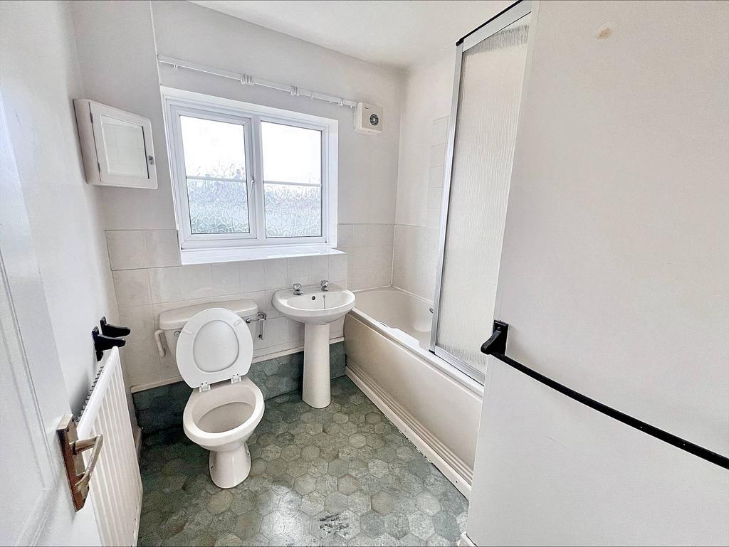 Having vinyl flooring, gas central heating, close coupled WC, wash hand basin with hot and cold water taps, extractor hoods, fitted bath, thermostatic shower, double glazed UPVC window to the front