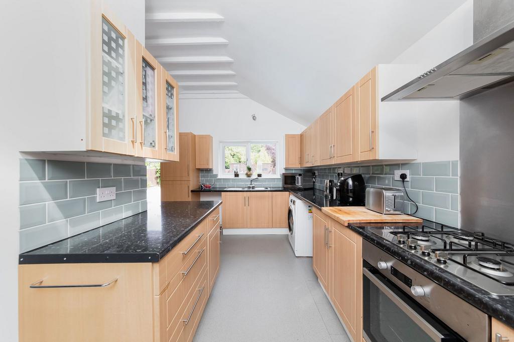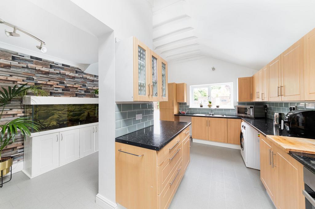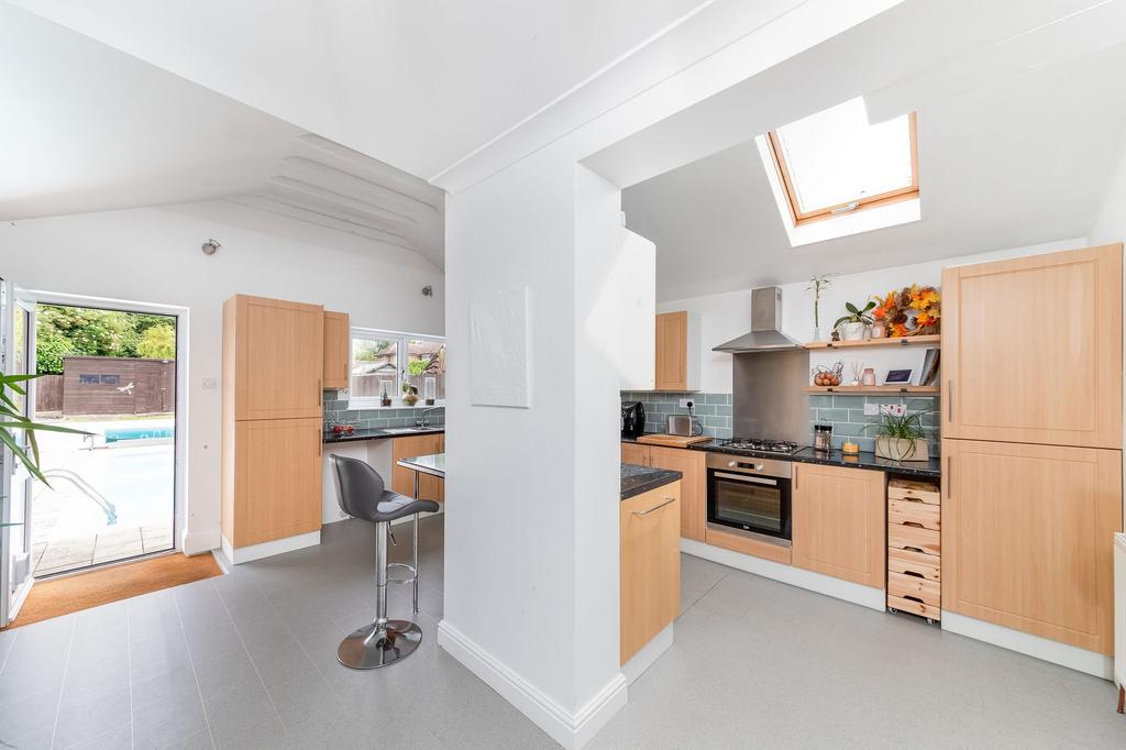 - Open plan kitchen and dining area looking out over the garden