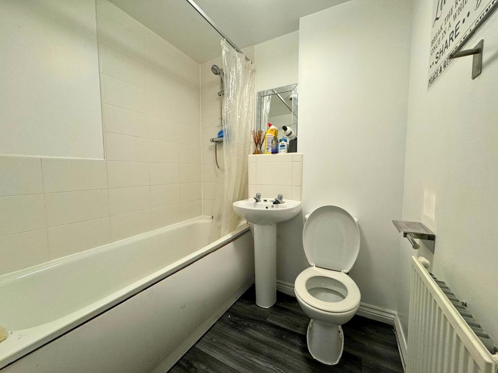 With a bath, tiled walls, new grey lino flooring, and a radiator, this room provides a spacious and functional area.