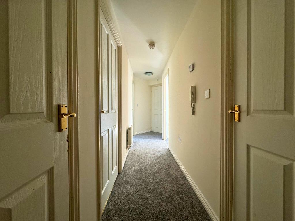 The property offers convenient access via stairs or a lift, and entry is secured through an intercom system. Upon entering, you'll find an inviting entrance hall that leads to all rooms, each newly carpeted for a fresh and modern feel. The apartment features two spacious bedrooms, both with new carpeting, as well as a large lounge area that boasts double-glazed windows, plenty of electrical outlets, and central heating, ensuring comfort throughout.