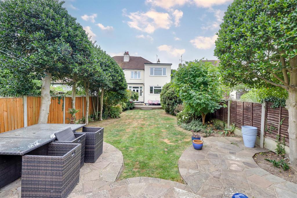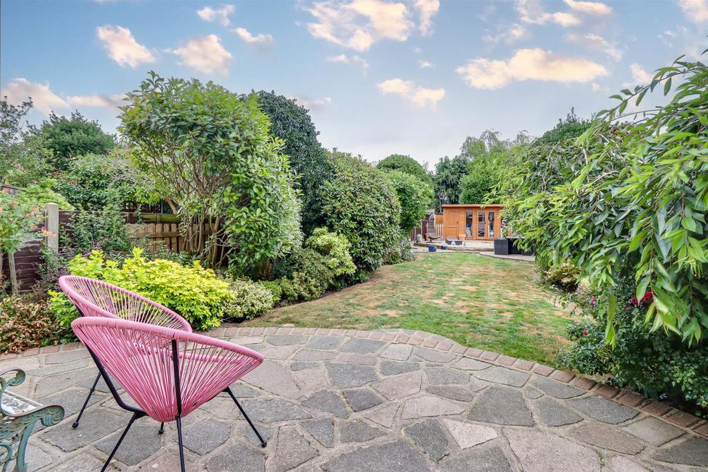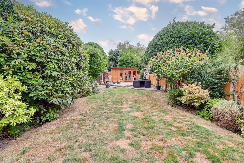 Large Rear Garden - Commences with a raised patio area with the remainder laid to lawn with established tree and shrub borders, raised shingle area to the very rear with a summerhouse, outside lighting, outside tap.