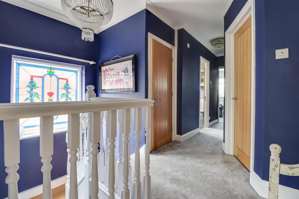 First Floor Landing - Smooth coved ceiling with pendant lights, double glazed leadlight feature window to the side, carpet, doors to all rooms.
