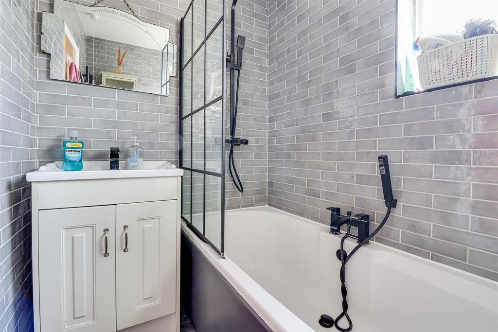 Bathroom - 2.52m x 1.54m (8'3" x 5'0" ) - Obscured double glazed windows to the side, smooth ceiling with inset spotlights and an extractor fan, vanity unit wash basin, paneled bath with a shower over, low-level w/c, heated towel rail, underfloor heating, fully tiled walls, marble effect tiled floor.