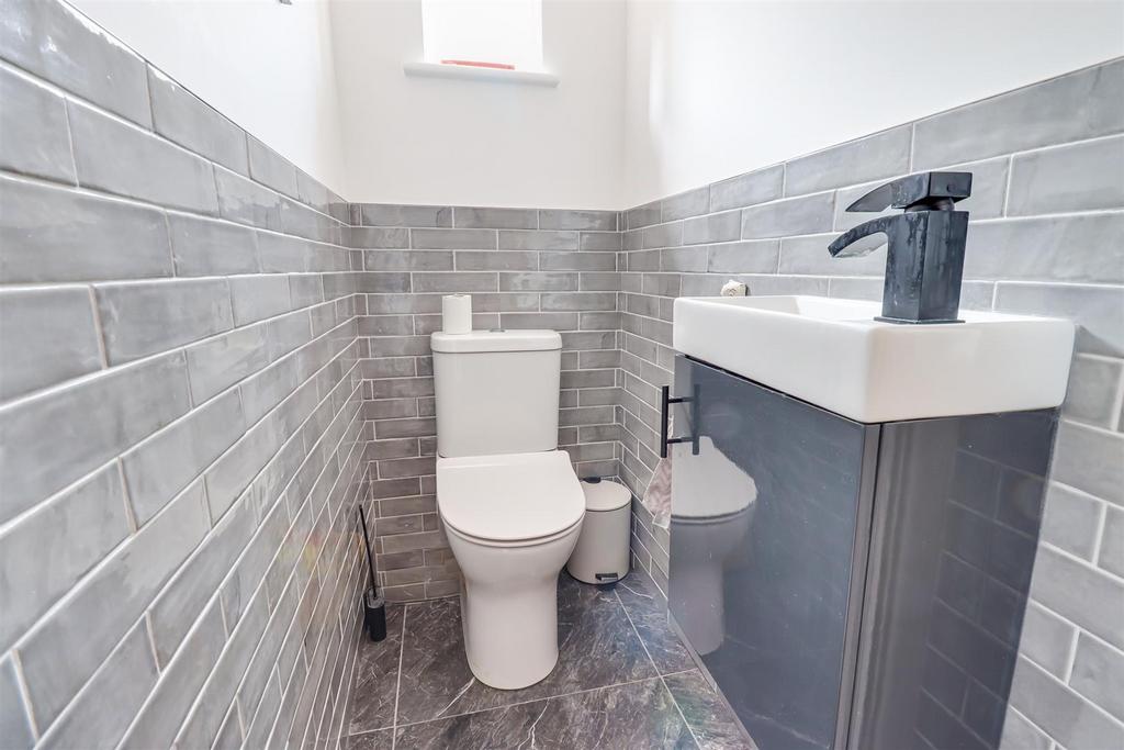 Separate Wc - 1.46m x 0.82m (4'9" x 2'8" ) - Obscured double glazed window to the side, smooth coved ceiling with inset spotlights, part tiled walls, low-level w/c, wall hung vanity unit wash basin, marble effect tiled floor.