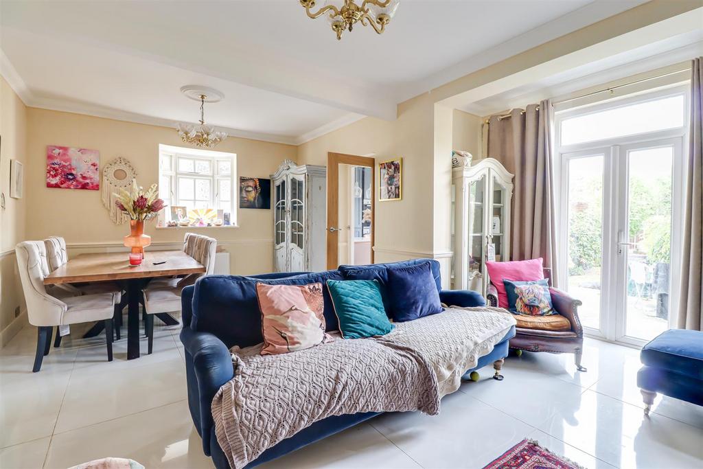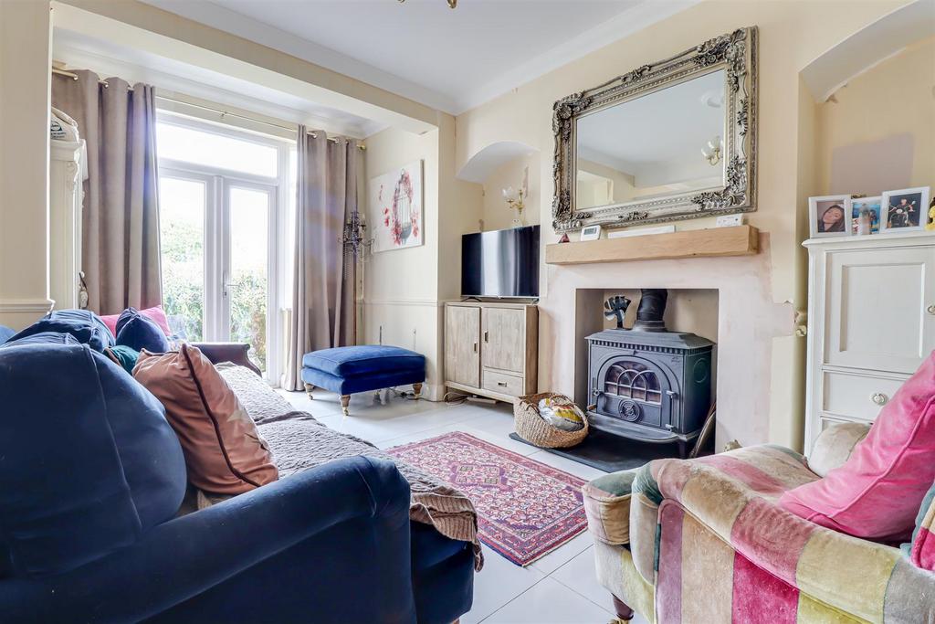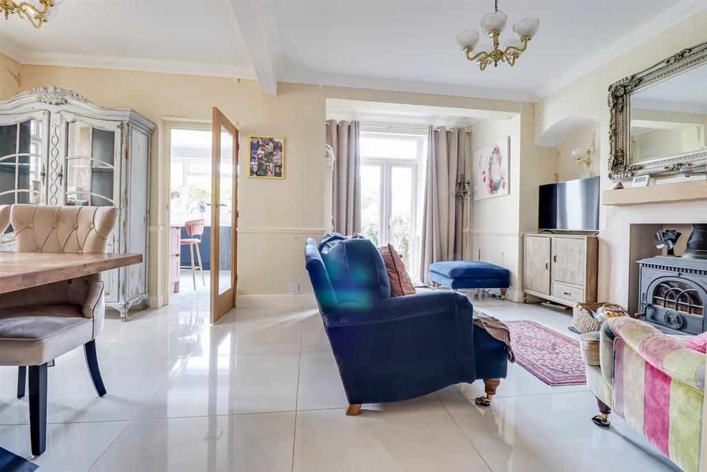 Family Room - 6.05m x 4.91m >3.46m (19'10" x 16'1" >11'4" ) - Smooth coved ceilings with two ceiling roses, bay window to the side, double glazed windows and French doors to the rear leading to the garden, dado rails, radiator, feature fireplace with log burner and a tiled hearth. tiled floor, door to: