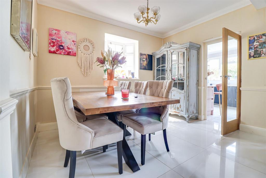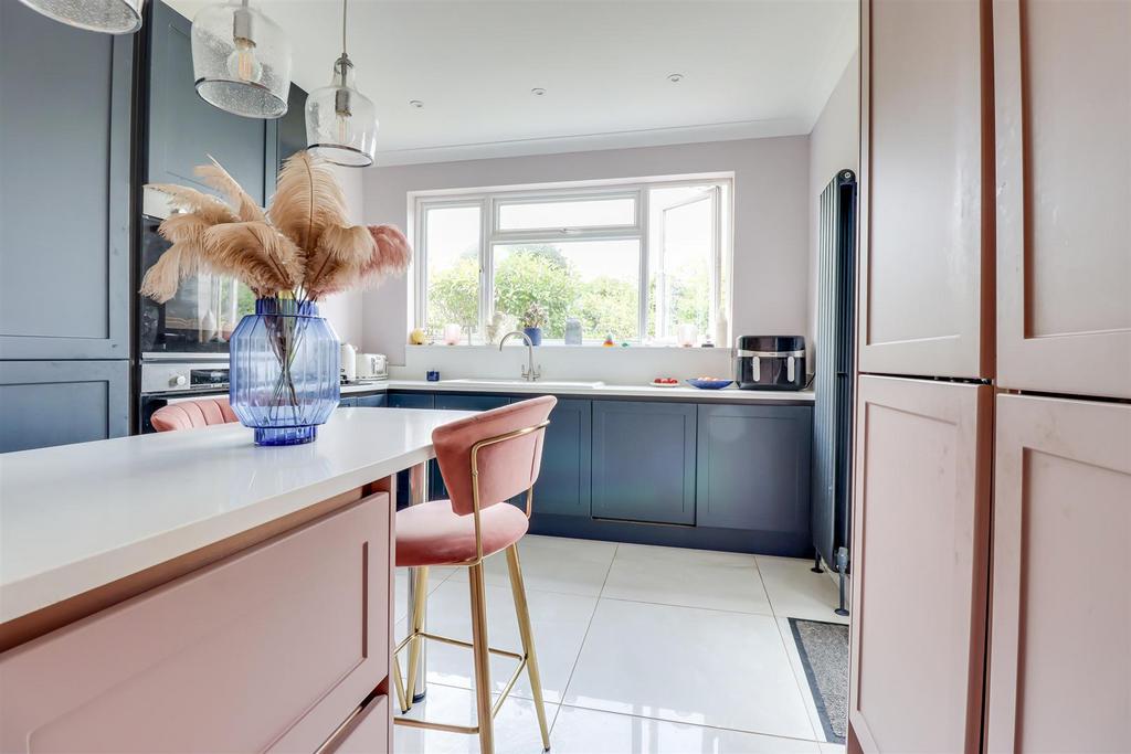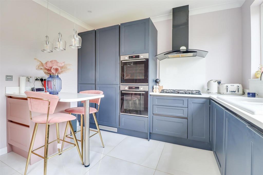 Kitchen - 3.37m x 3.20m (11'0" x 10'5" ) - Smooth coved ceiling with inset spotlights. Modern shaker style kitchen comprising of floor to ceiling and base level units with a white quartz worktop, 1.5 ceramic sink and drainer with a chrome mixer tap, breakfast bar area, pan drawers, integrated appliances including; fridge freezer, Bosch double oven, five ring gas hob with an extractor fan above, quartz splashback, vertical column radiator, double glazed windows to the rear overlooking the garden, UPVC double glazed door to the side leading out to the garden.