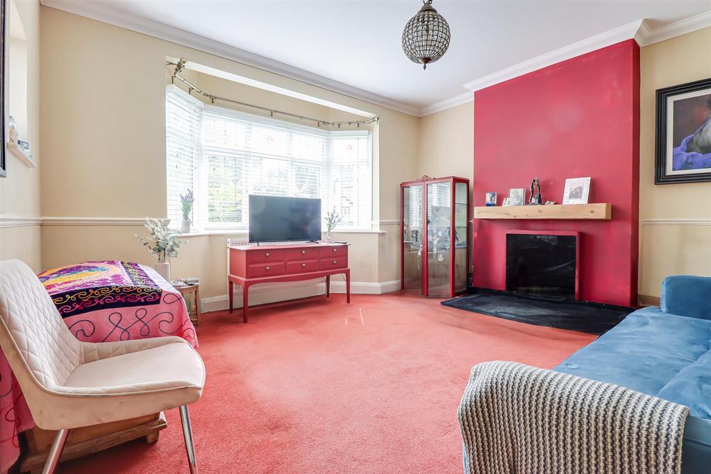 Front Lounge - 4.11m into the bay x 4.09m (13'5" into the bay x - Smooth coved ceiling with a ceiling rose, double glazed bay windows to the front, feature stained glass leadlight window to the side, feature fireplace with space for a wooden log burner and a tiled hearth, dado rail, carpet.