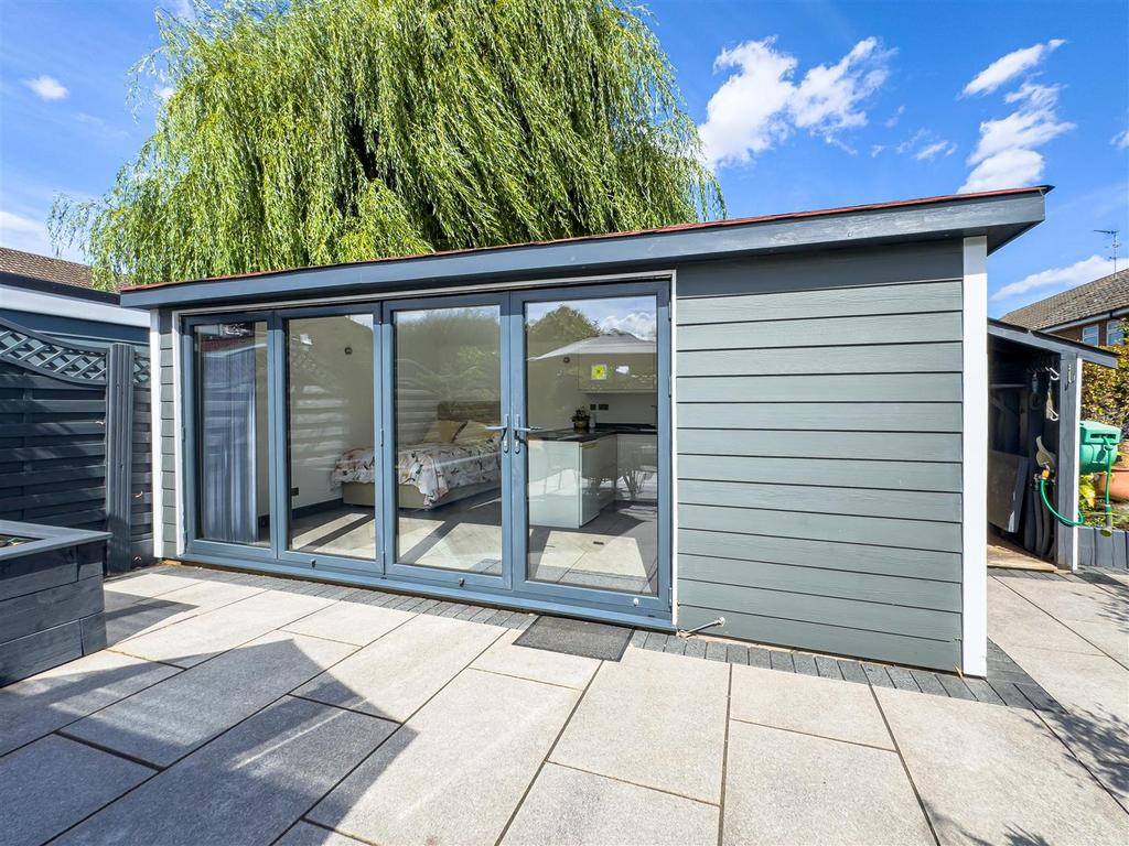 Exterior - Externally, the property offers off-street parking on a block-paved driveway for approximately three vehicles, with additional parking in front of the garage. The garage is equipped with an electric over-shutter door and power supply, while a second, larger garage behind it has double-opening doors and space for another vehicle. Both sides of the property provide access to the rear garden.