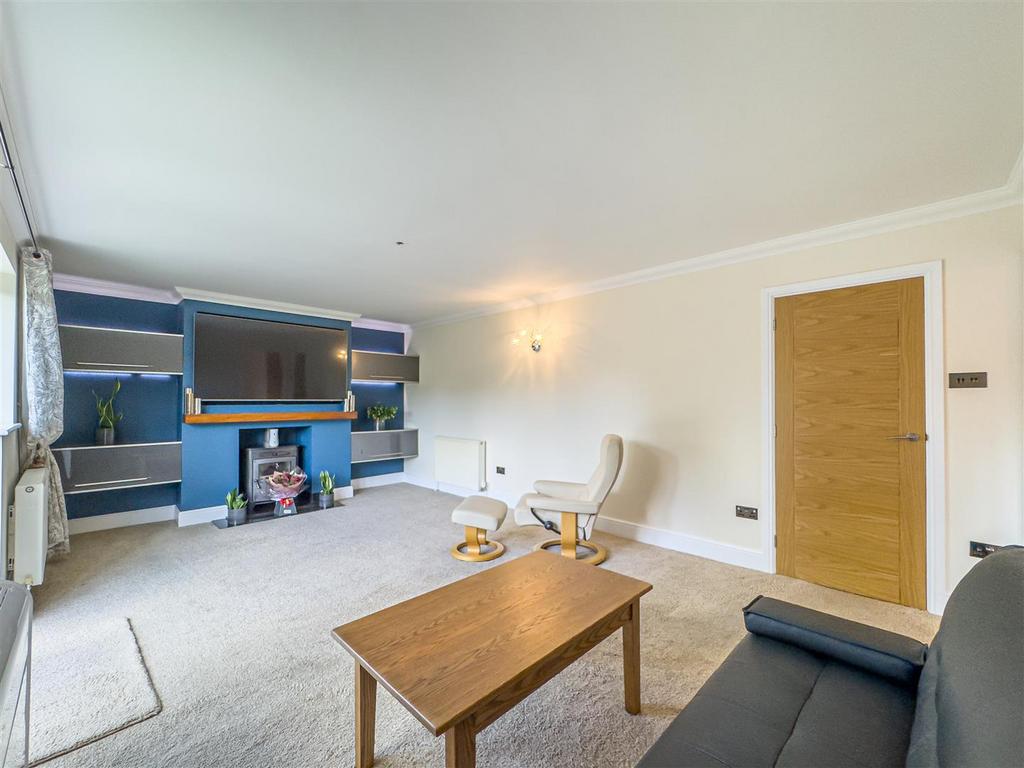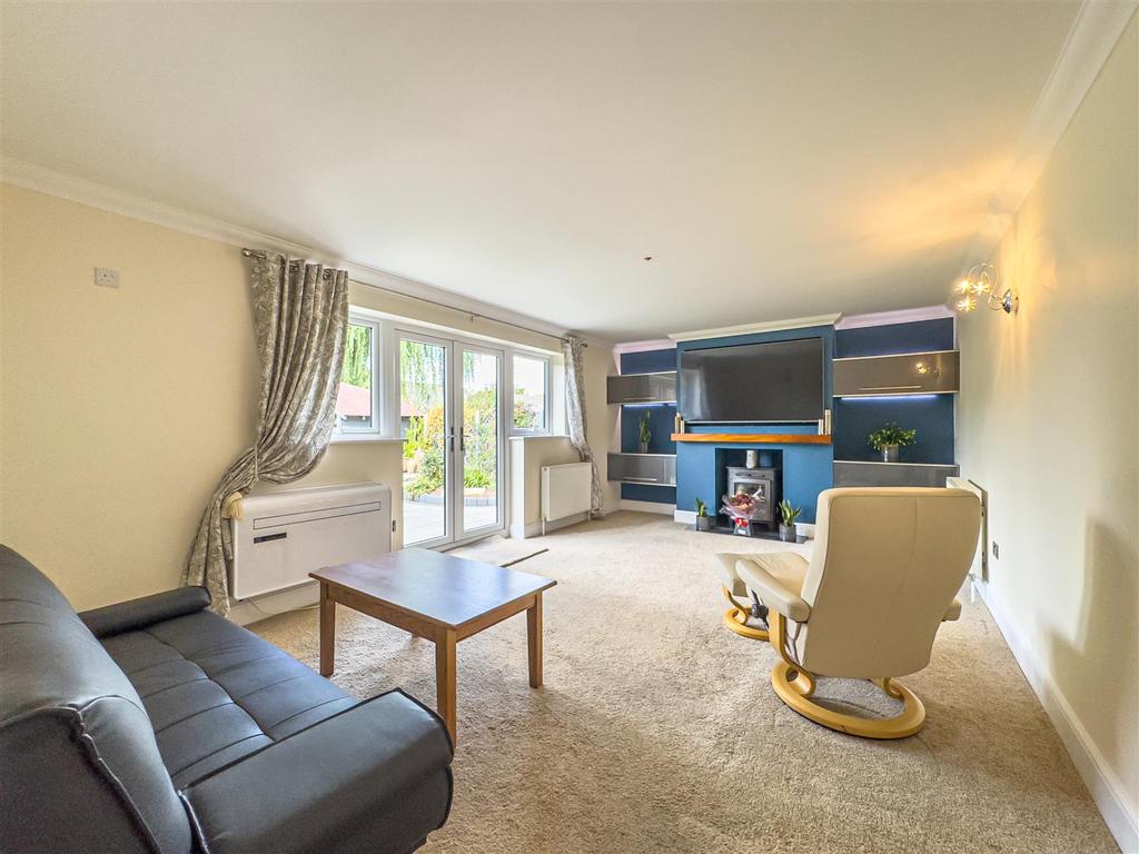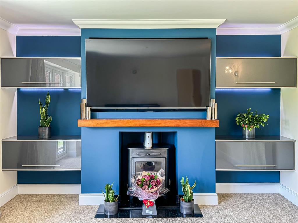 At the rear of the property, the main living area has been fully refurbished and features a large media wall with a working log burner, creating a cozy yet sophisticated atmosphere. Patio doors open onto the rear patio, and there's a separate dining area ideal for family gatherings.