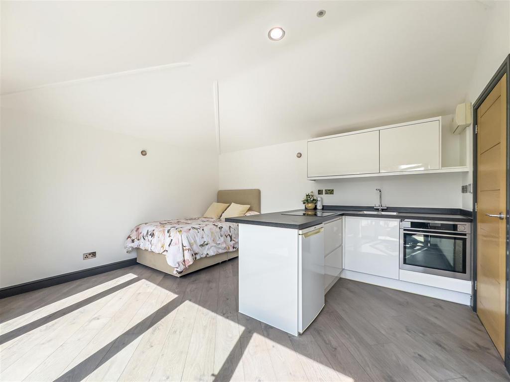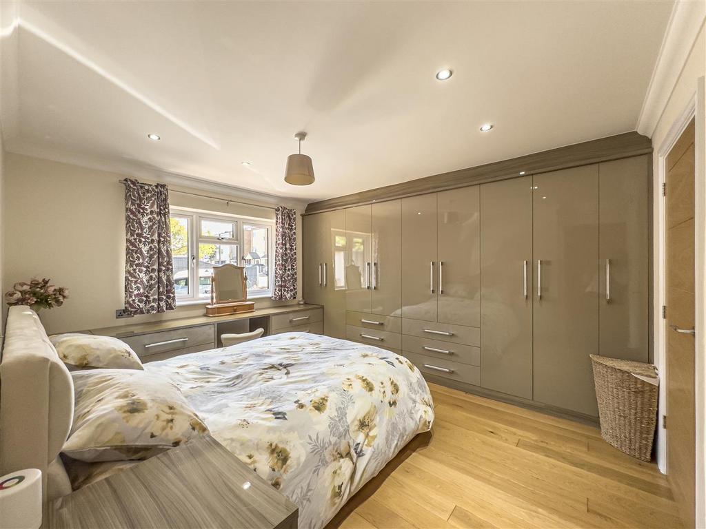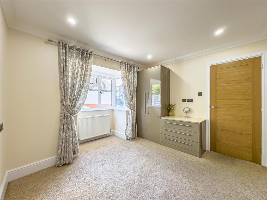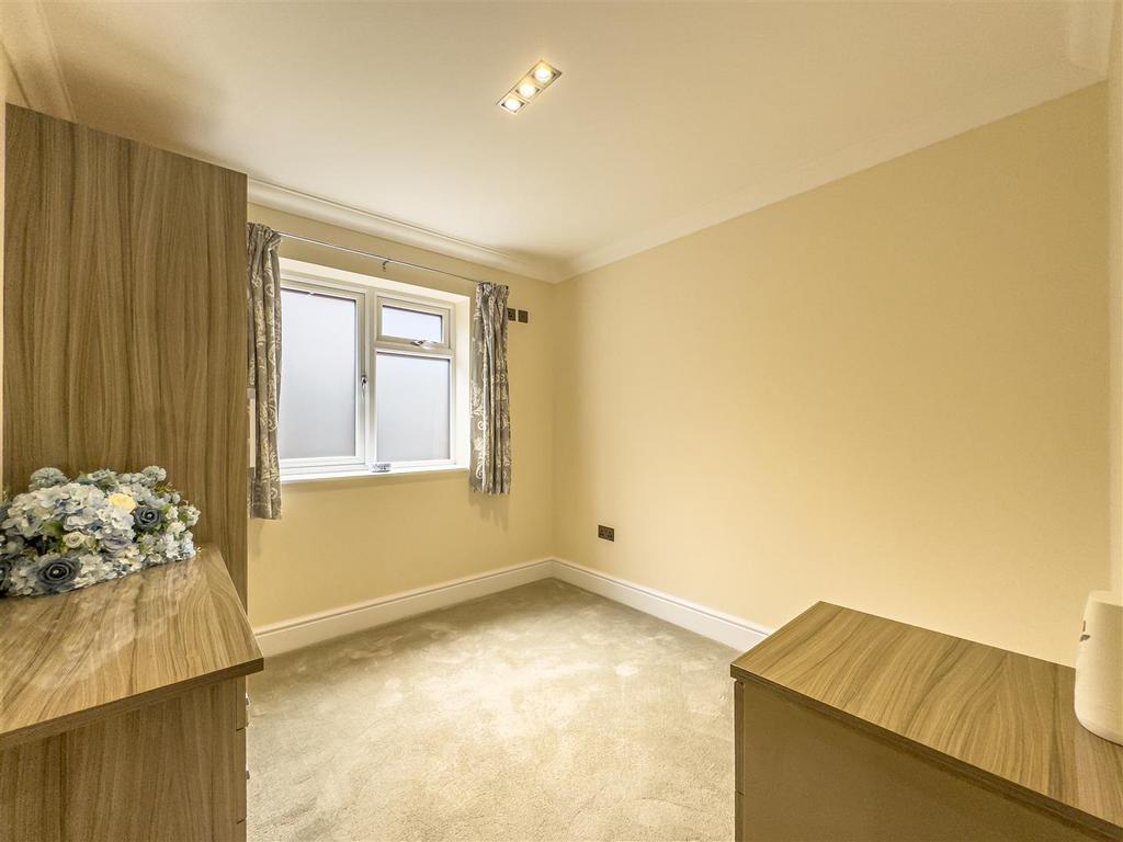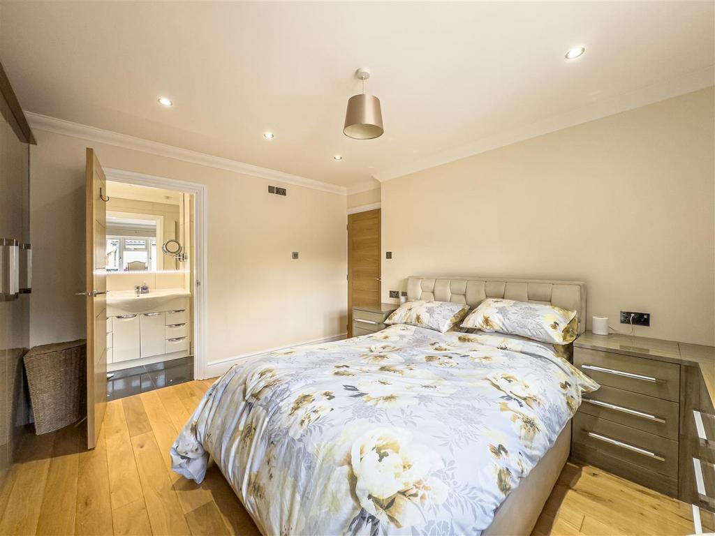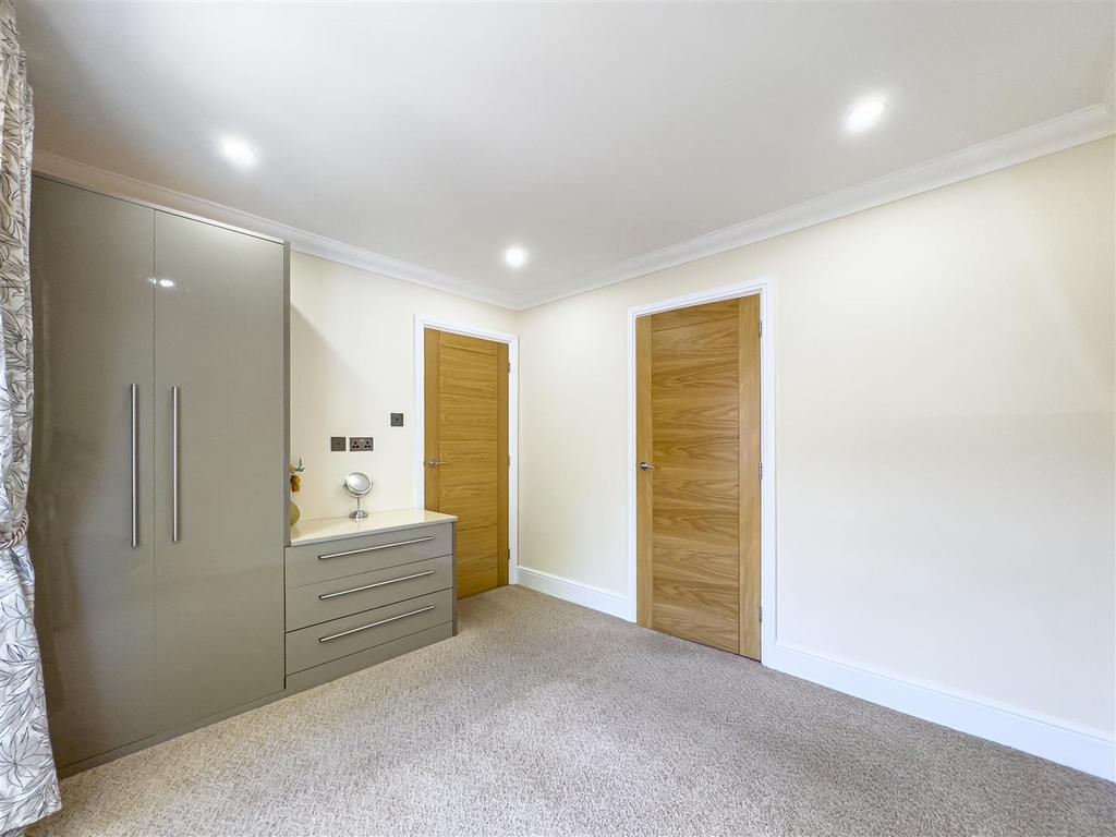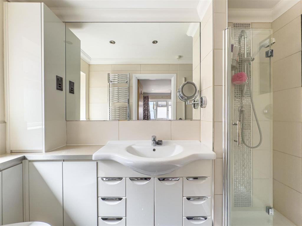 The primary bedroom is a highlight, featuring bespoke fitted wardrobes, inset lighting, and a large front-facing window that floods the room with natural light. This bedroom also benefits from its own three-piece en-suite bathroom, offering both convenience and privacy. The second bedroom is equally impressive, with a large bay window, space for built-in storage, and its own well-appointed three-piece en-suite.