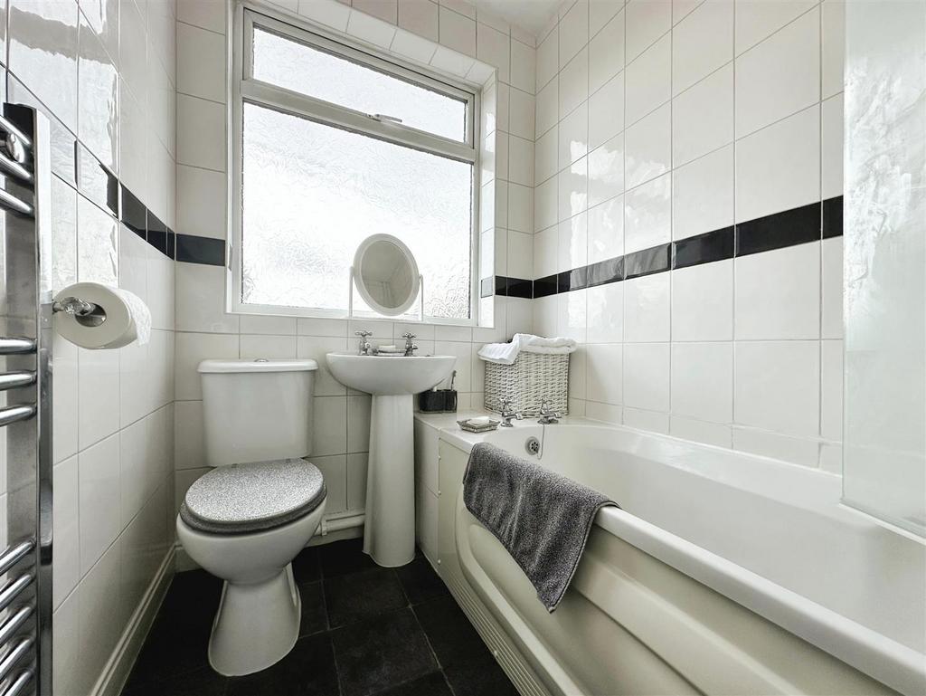 House Bathroom - 2.06m x 1.56m (6'9" x 5'1") - Fitted with a three-piece suite in white, comprising; panelled bath with shower over, low level WC, pedestal sink unit, heated towel rail and full tiling to the walls plus UPVC double glazed window to the rear.