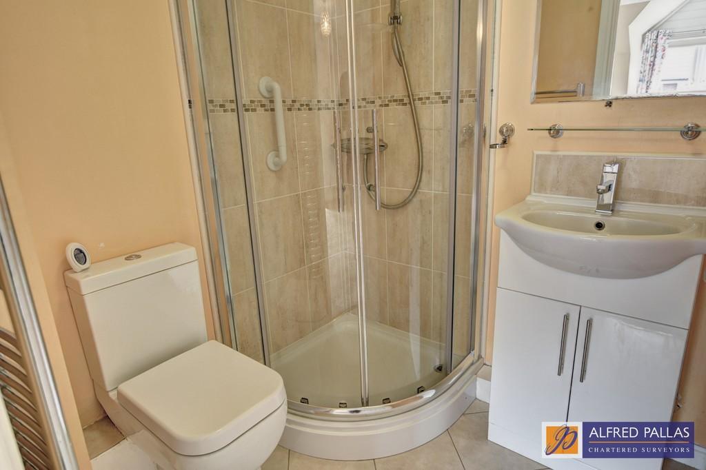 ENSUITE SHOWER Tiled shower enclosure; vanity wash hand basin with cupboard beneath and mixer tap; low level wc; extractor fan; tiled floor; heated towel rail