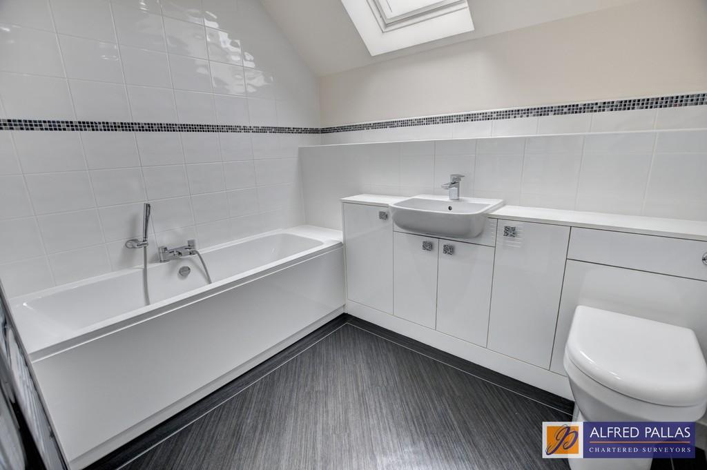 BATHROOM/WC Panel bath with mixer tap and shower over; vanity wash hand basin with cupboard beneath and mixer tap; low level wc; white suite; spotlights; partly tiled walls; Amtico flooring; heated towel rail (chrome plated)