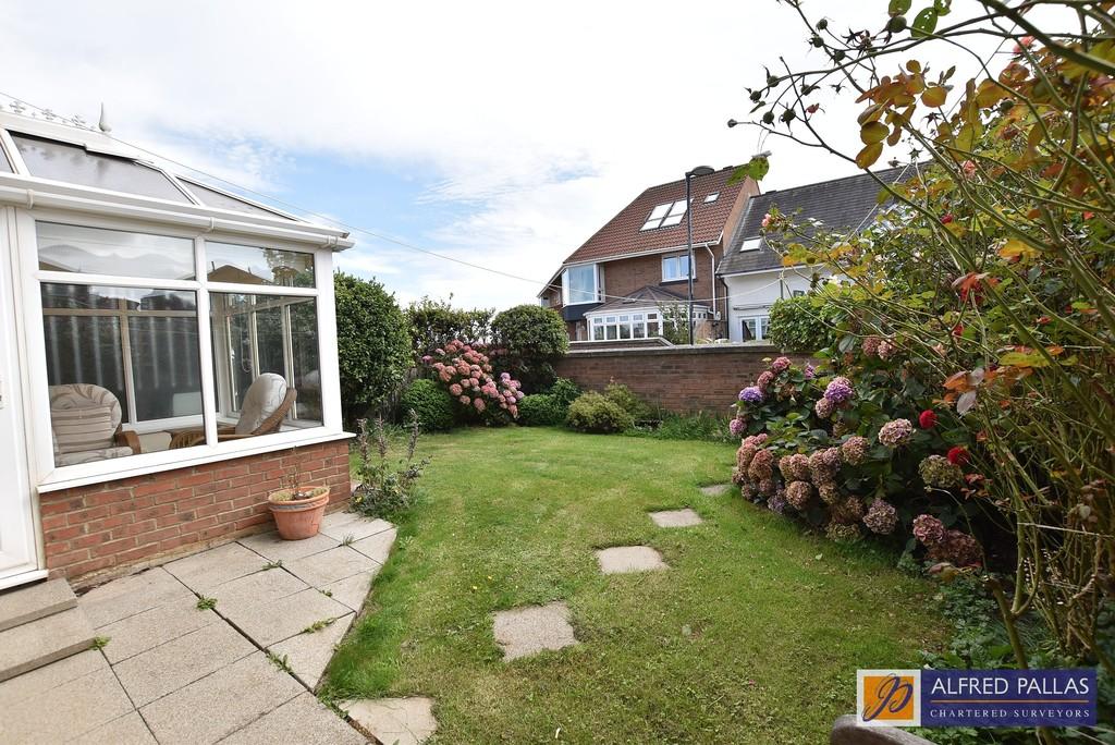 Pleasant south-facing rear garden with lawn, paved areas, flowerbeds and outside tap