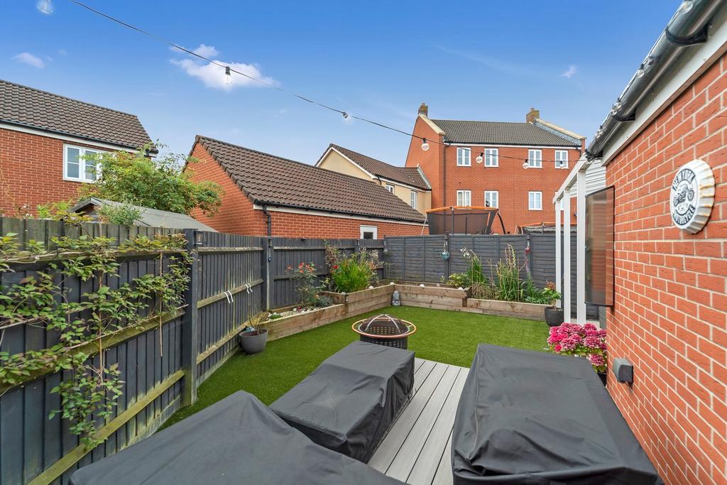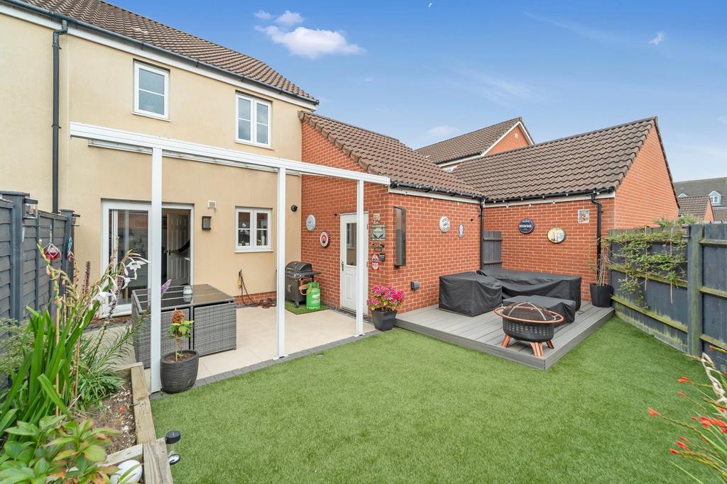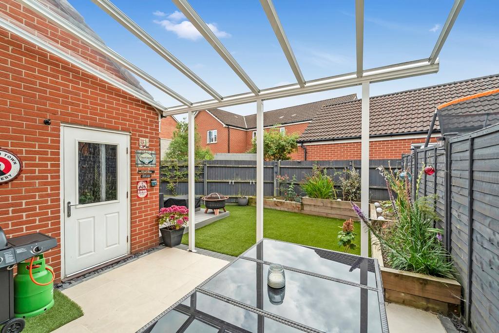 A beautiful landscaped garden, with its lovely patio area with over head cover, decked area, artificial grass area, raised flower borders, this garden lends itself to entertaining, relaxing, barbecues, and enjoying the sunshine.