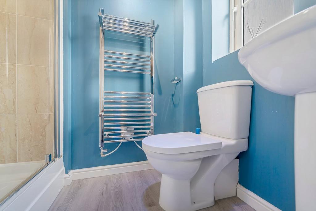 Shower cubicle, wash hand basin, WC, heated towel rail