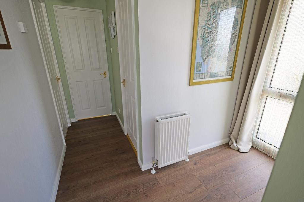 There is a useful built-in storage cupboard with sliding doors, wall mounted coat hooks and a shelf. A radiator, wood effect laminate flooring and loft access via a retractable ladder and is majority boarded and has an electric light.