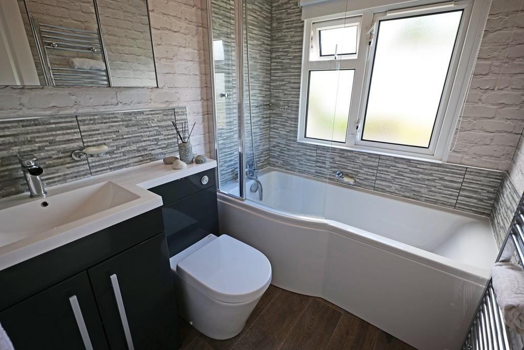 Refurbished and stylishly fitted with a three piece white suite, comprising a 'P' shaped bath with a 'waterfall' style mixer tap and a shower over, tiled splashback and a glazed shower screen. A w.c and wash hand basin with a 'waterfall' style mixer tap which both are fitted into a base vanity unit with a fitted shelf and a wall mounted mirror fronted cupboard above. Chrome radiator/heated towel rail, pvc double glazed frosted glass window, wood finish laminate flooring and extractor fan.