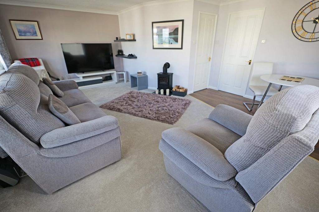 With LPG central heating and pvc double glazing, the tastefully furbished and decorated accommodation briefly comprises an entrance hall, with a good sized and very useful cloaks/storage cupboard and access, via a retractable ladder to a majority boarded loft space. The delightful, spacious lounge/diner is flooded with natural light from three windows in two elevations, with fabulous far-reaching views from the two bow windows, and features an electric stove style fire. Also a good size, the kitchen is fitted with a range of white units and drawers, there are two double bedrooms, both with built-in wardrobes, which give excellent storage space, and a stylishly refurbished three-piece bathroom, with a shower over the bath.
