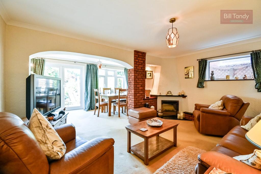 4.63m x 3.70m (15' 2" x 12' 2") having a corner living flame gas fire standing on a tiled hearth with recessed lighting, double radiator, obscure glazed window to side, useful under stairs storage cupboard, coving and wide archway through to: