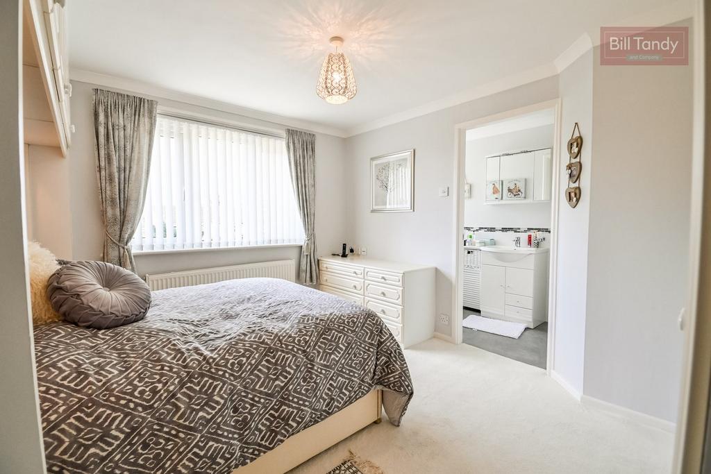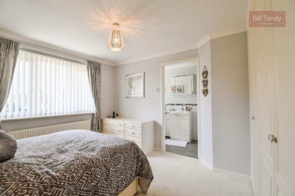 3.82m x 3.26m (12' 6" x 10' 8") having two double doored built-in wardrobes and bed surround with overhead storage cupboards, corner glazed display shelving with integral lighting and bedside cabinets, separate chest of drawers, UPVC double glazed window to rear with far-reaching views, radiator, coving and door to: