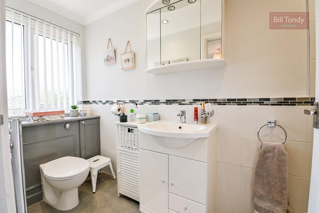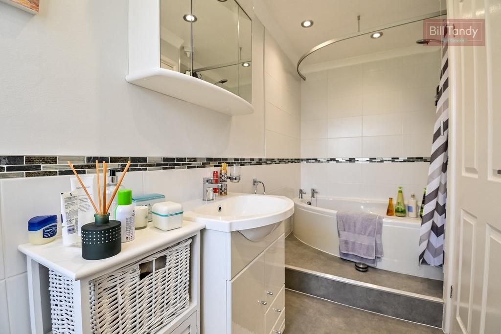 3.34m x 2.12m (10' 11" x 6' 11") having ample preformed work surfaces and stylish doored base cupboards and drawers, together with matching wall-mounted units. There is an integrated oven with four ring gas hob and extractor, space and plumbing for a washing machine, integrated fridge and freezer with marching facia, under-cupboard lighting, single drainer sink and mixer tap, UPVC double glazed window to front, tiled splashback and flooring.