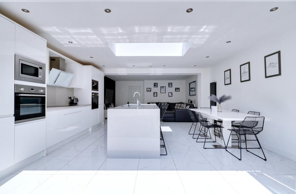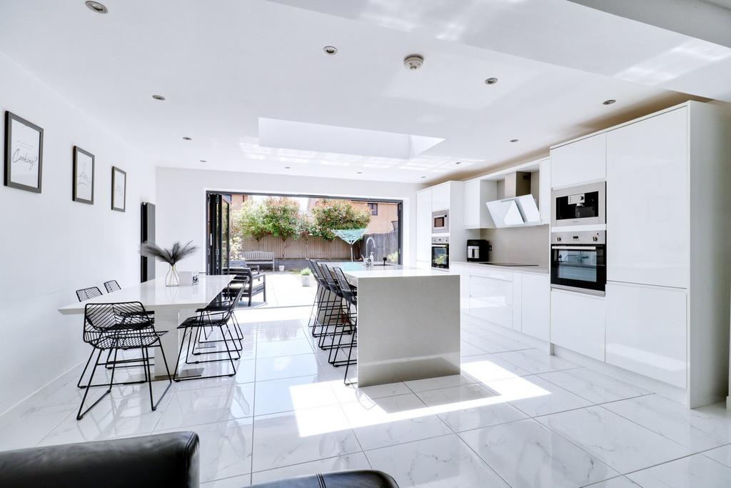 5.1m x 4.58m (16' 9" x 15' 0") Inset spotlights to ceiling, lantern skylight window to ceiling, a range of integrated handled matching wall and base units, granite work surfaces, two integrated ovens, integrated microwave, integrated coffee machine, four ring induction hob, extractor hood, integrated fridge, integrated freezer, kitchen island with granite worktop over a range of base units, integrated dishwasher, inset sink with hot and cold mixer tap, breakfast bar area, two gun-metal grey vertical radiators, porcelain tiled flooring, grey uPVC framed double glazed bi-folding doors to rear opening to rear garden.