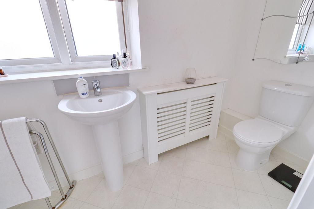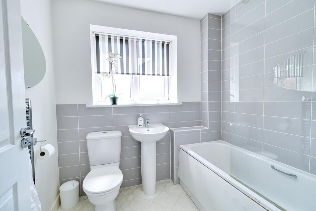 2.21m x 1.86m (7' 3" x 6' 1") Obscure double glazed windows to rear, panelled bath, shower, low-level flush WC, hand wash basin, part tiled walls, chrome hand towel radiator, vinyl flooring.