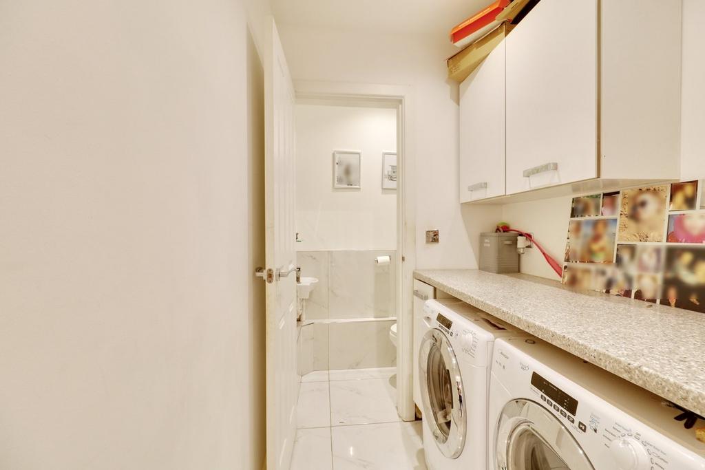 1.9m x 1.45m (6' 3" x 4' 9") A pair of wall units, laminate work surface over space and plumbing for washing machine and space for tumble dryer, one single base unit, porcelain tiled flooring.