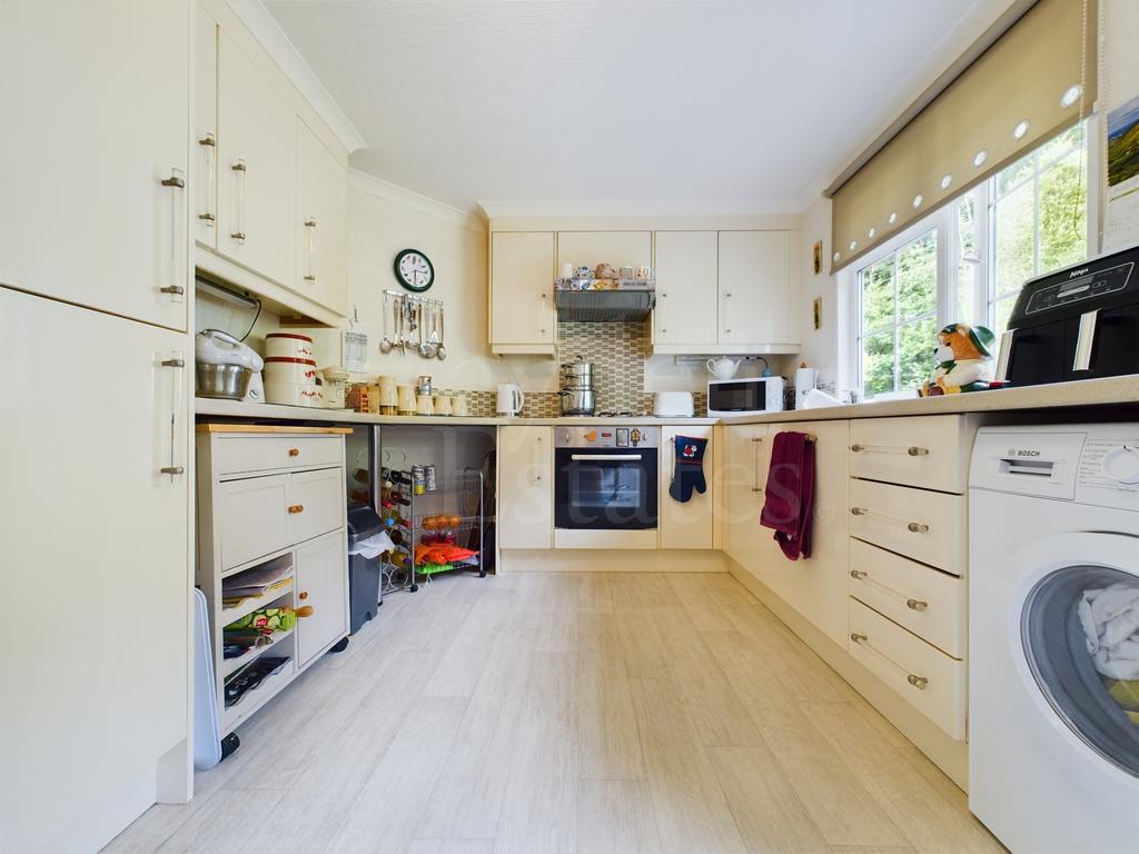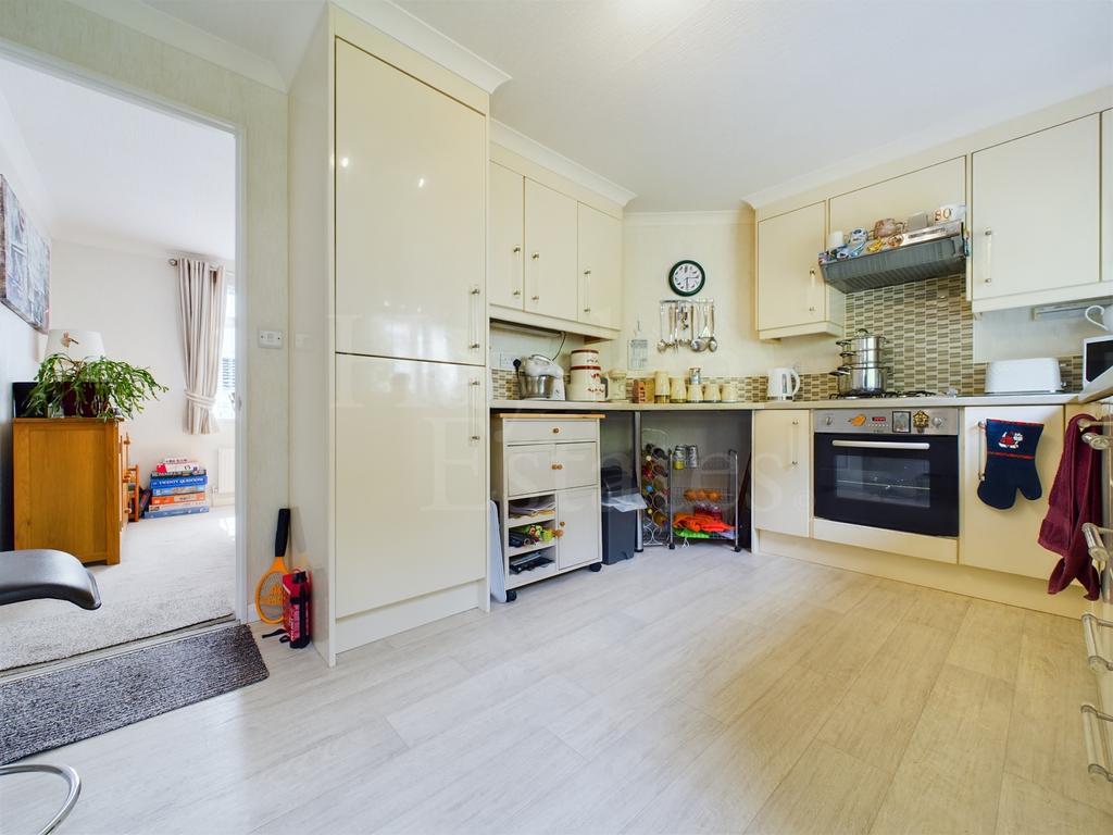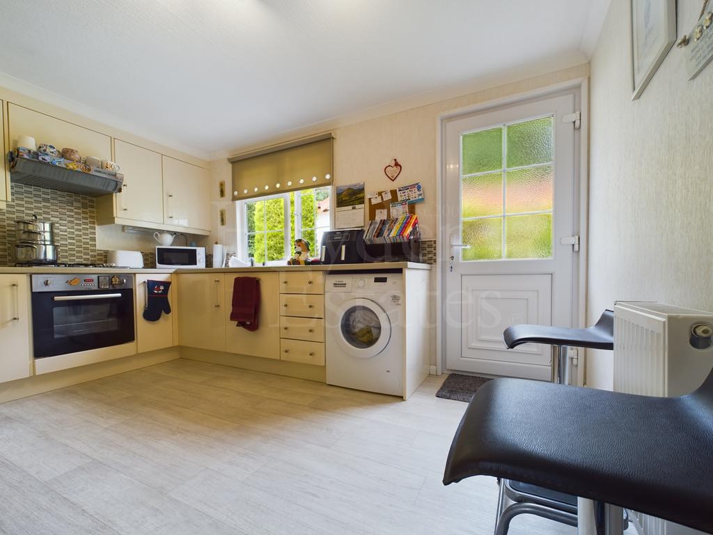 With side door and window, LVT flooring, coving to the ceiling, ceiling light point and radiator. Having a range of units to both wall and base with the latter boasting complimentary roll edged working surface over. Inset stainless steel sink unit with mixer tap over. Partial tiling to the walls providing splash back. Inset four ring gas hob unit having extractor over. Built in electric oven. Integral dishwasher and fridge freezer.