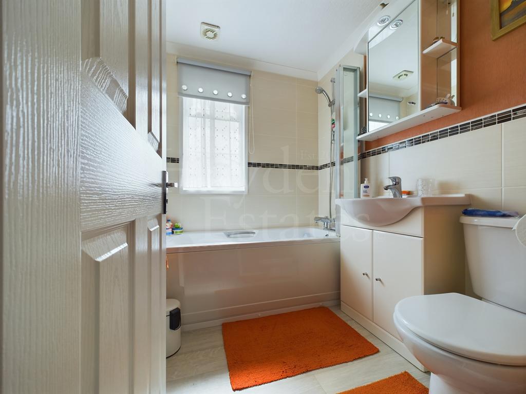 side facing window, coving to the ceiling, LVT flooring, ceiling mounted extraction fan and towel radiator. Panelled bath having mixer shower tap and fitted bi folding shower door. Vanity sink unit with mixer tap and close coupled wc suite. Partial tiling to the walls providing splash back.