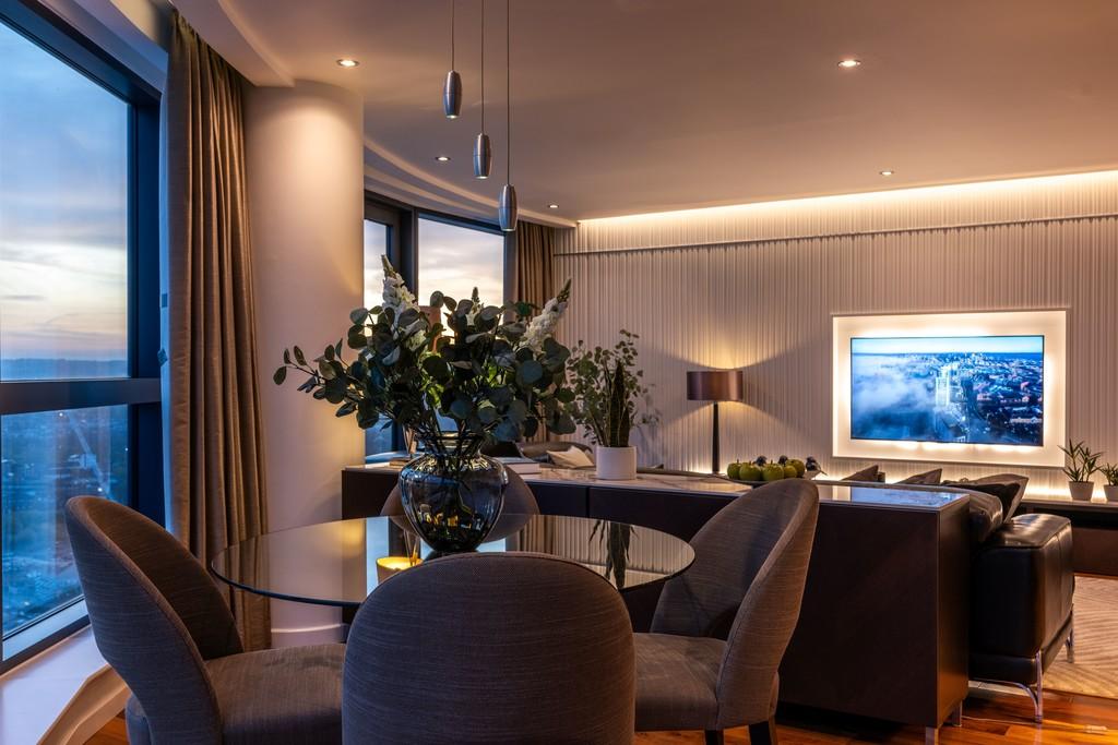 LOUNGE The heart of the penthouse is a spacious open-plan living and dining area, bathed in natural light from floor-to-ceiling windows that showcase sweeping views across Leeds. Rich walnut floors and carefully considered ambient lighting create an atmosphere that is both relaxed and sophisticated - perfect for entertaining or simply enjoying the space.