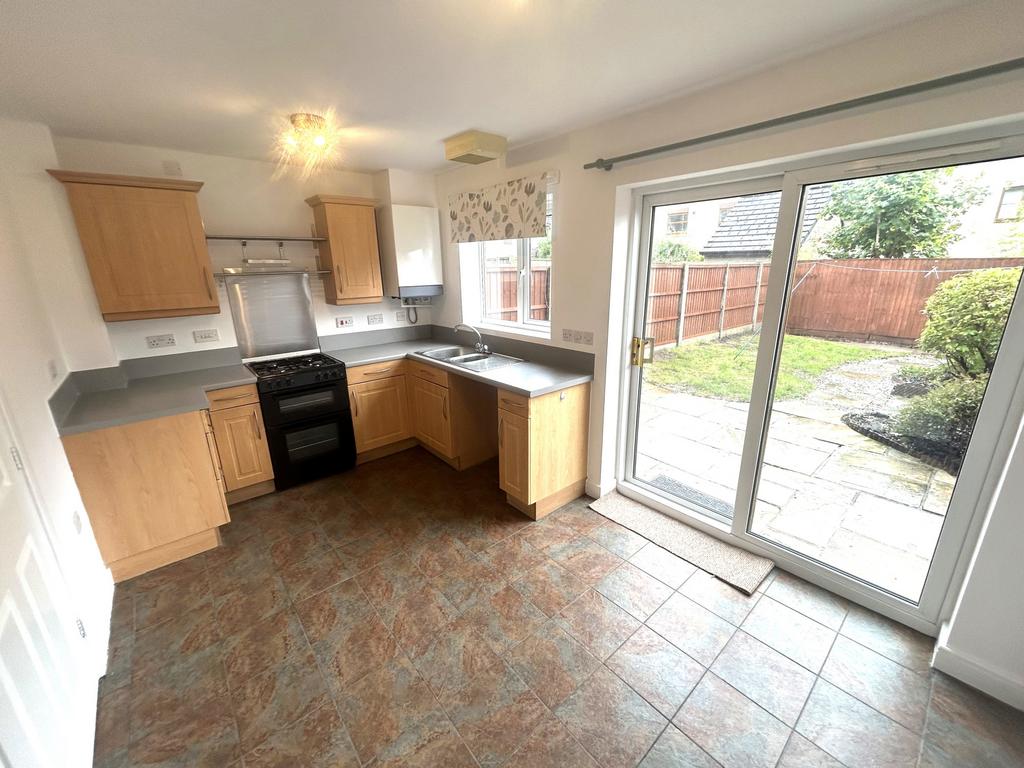 A range of fitted wall & base units with a built in gas hob and electric cooker. Stainless steel sink & drainer with mixer taps. Extractor fan. Fitted utensils unit. Upvc double glazed window and sliding doors to the rear elevation. Tiled flooring, radiator and a ceiling light point. Under stairs storage - With lighting and shelving.