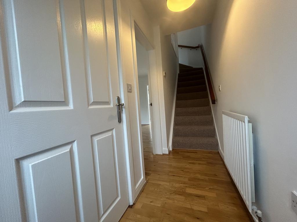 Entrance door and wooden flooring. Ceiling light point and a radiator. Stairs to the first floor.