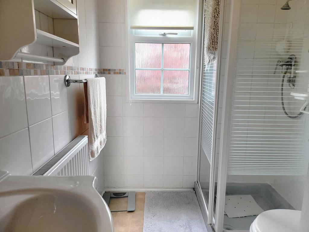 Thermostatic mixer shower in corner enclosure with vanity unit sink and low level toilet. Laminate tiled floor and fully tiled walls with radiator and obscure Upvc double glazed window to the side elevation.