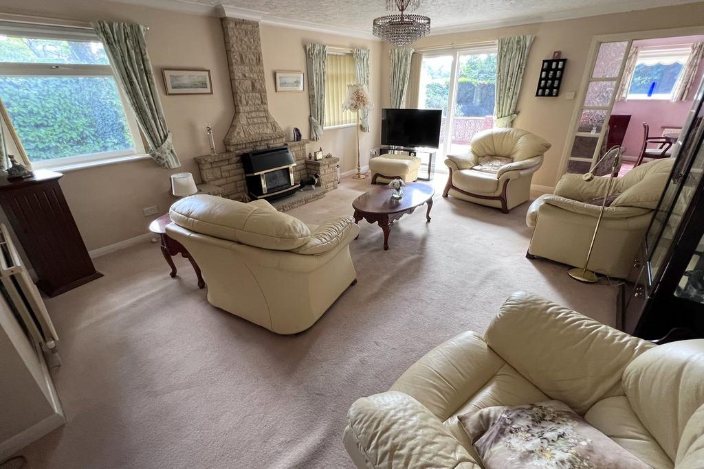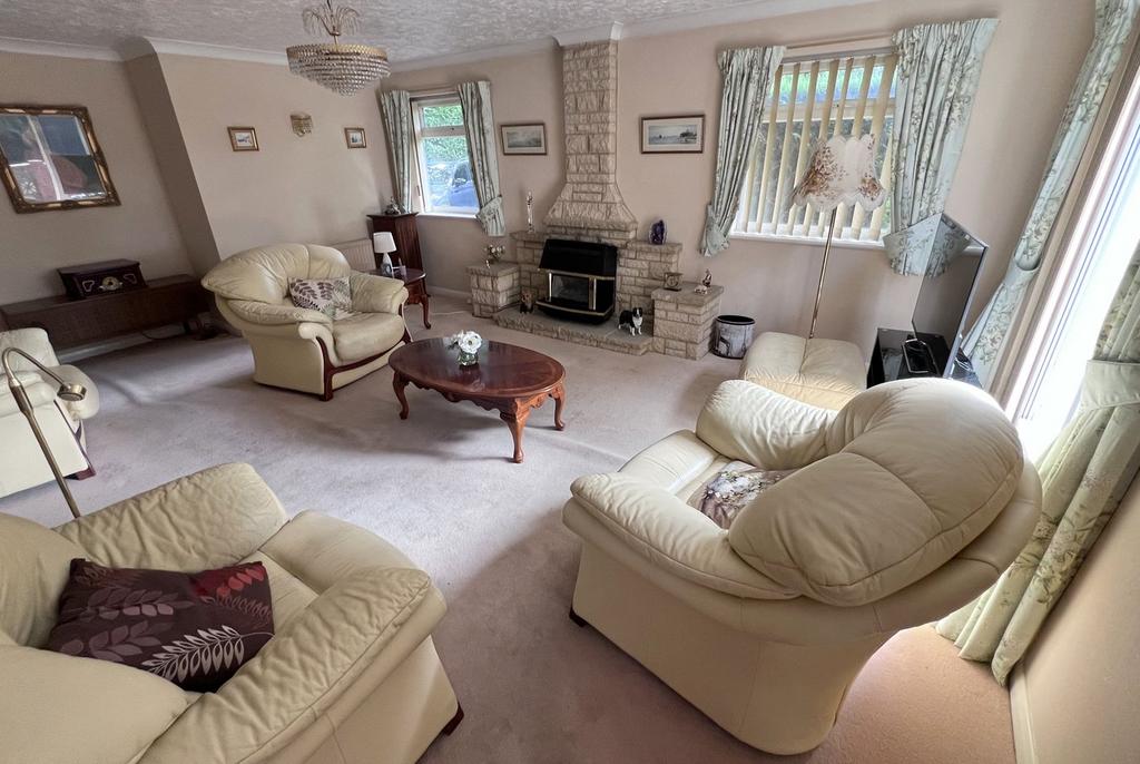 • Living room with dual aspect double glazed windows and sliding patio doors, central Purbeck stone mantle, doorway to the dining room