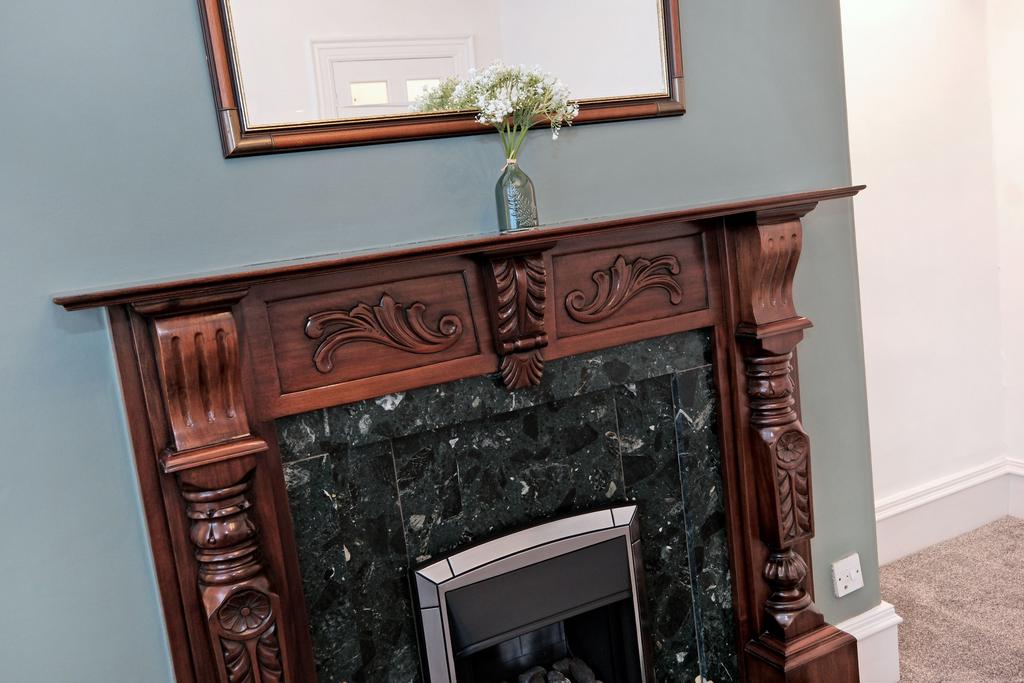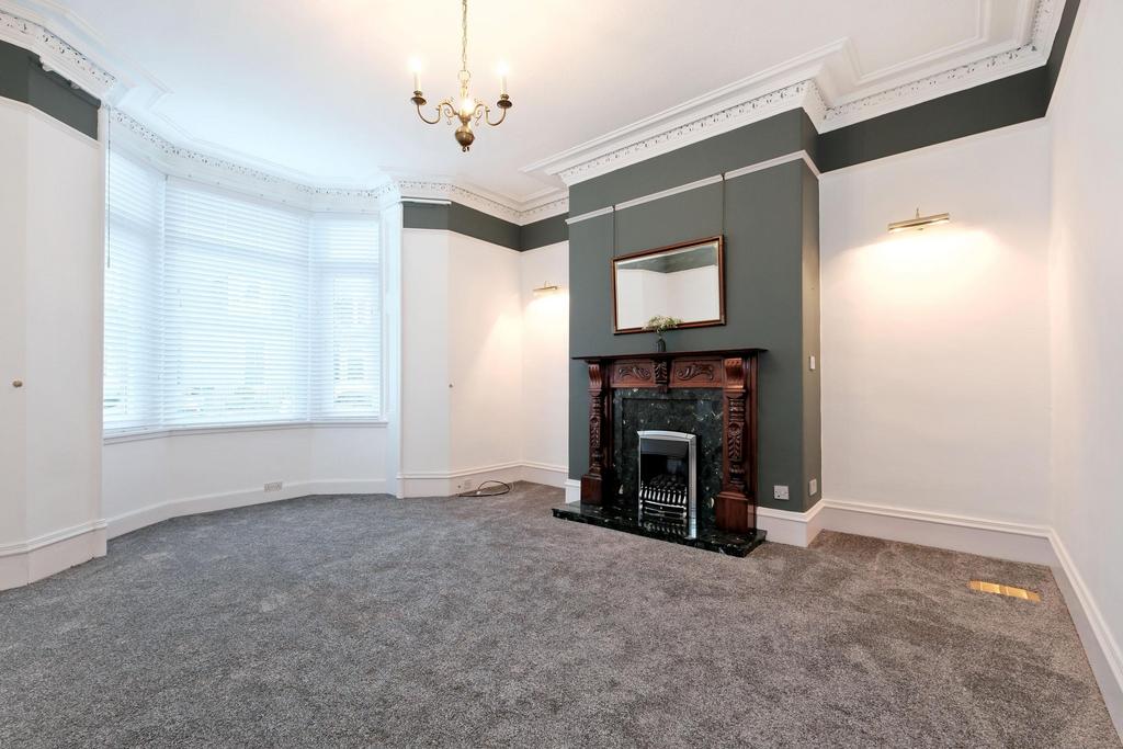 Large bright room with south facing bay window and fitted blinds. Fresh decor and new grey carpet. Marble fireplace & Hearth with Ornate mahogany surround, living flame coal effect gas fire with alcoves on either side. Stunning period features such as high ceiling, ceiling rose, cornices, two wall lights and a picture rail.
